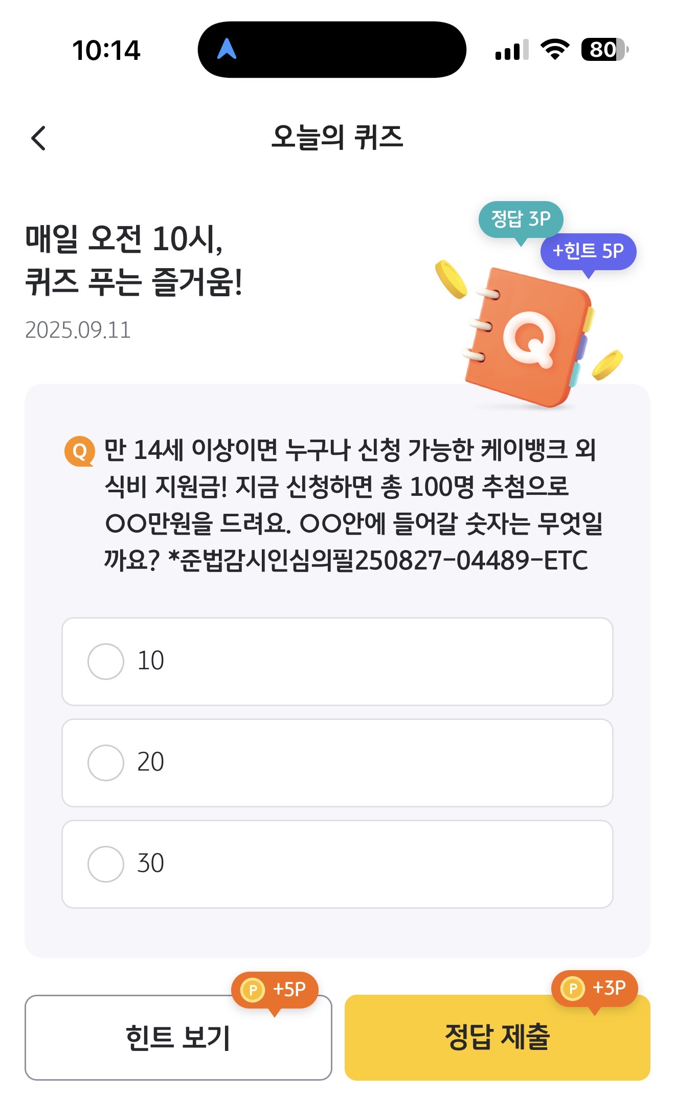 만 14세 이상이면 누구나 신청 가능한 케이뱅크 외식비 지원금! 지금 신청하면 총 100명 추첨으로 OO만원을 드려요. OO안에 들어갈 숫자는 무엇일까요? *준법감시인심의필250827-04489-ETC 보기는 1. 10 2. 20 3. 30 입니다