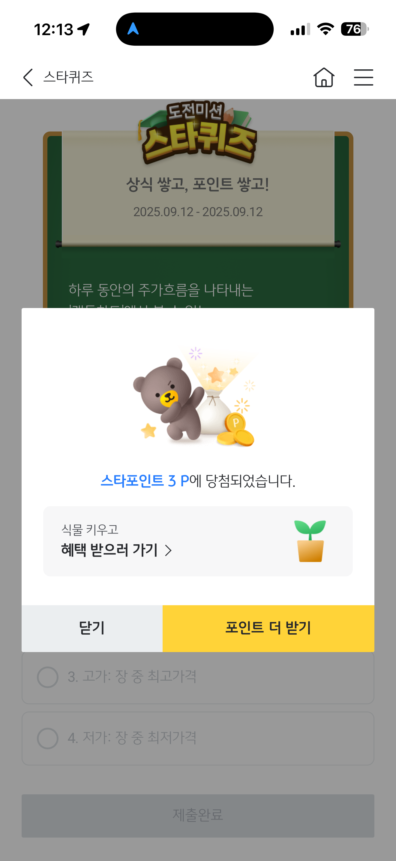 KB스타뱅킹 스타퀴즈 정답은 2. 종가: 중간가격 입니다