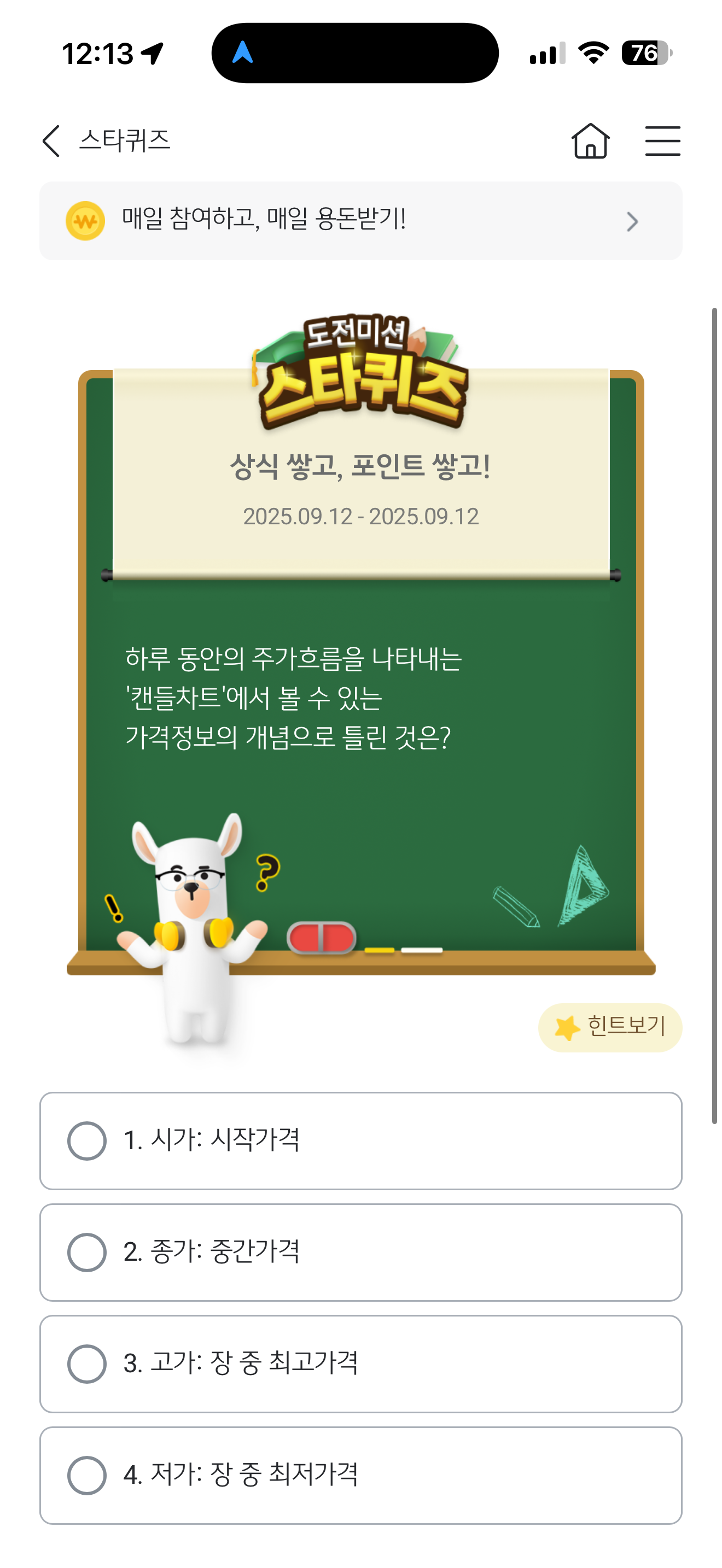 KB스타뱅킹 스타퀴즈 9월 12일 정답(하루 동안의 주가흐름을 나타내는 '캔들차트'에서 볼 수 있는 가격정보의 개념으로 틀린 것은?)