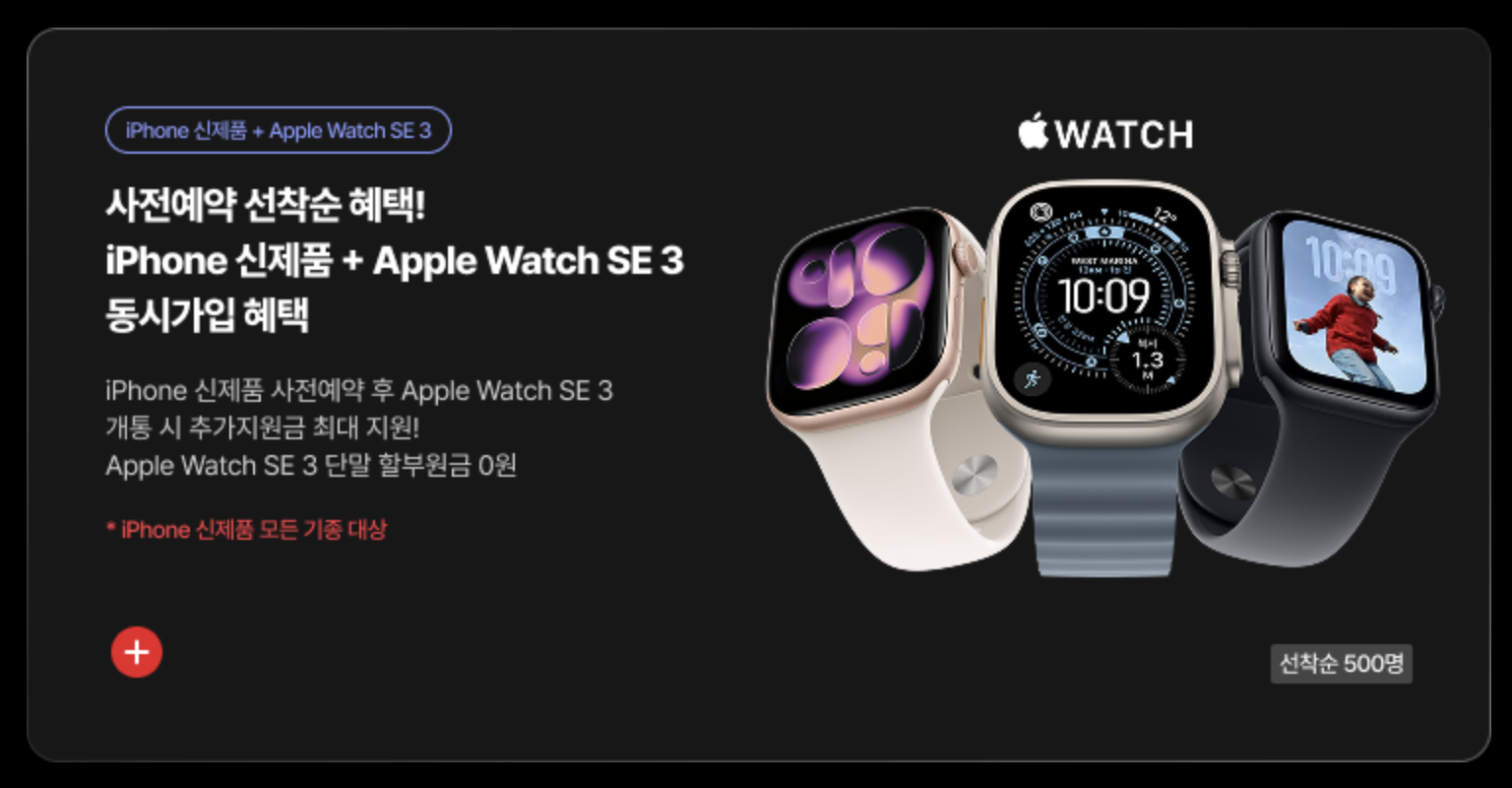 아이폰을 사용하는 분들은 애플워치 조합은 필수라 할 수 있습니다. 특히 통신을 지원하는 애플워치를 사용하면 운동할때 아이폰을 휴대하지 않아도 되서 정말 편한데요. KT닷컴 아이폰 17 사전예약 혜택으로 애플워치 SE3 개통시 추가 지원금을 최대로 지원해 애플워치의 할부원금이 0원이 됩니다. 이 혜택은 선착순 500명 한정이니 서두르셔야 합니다.