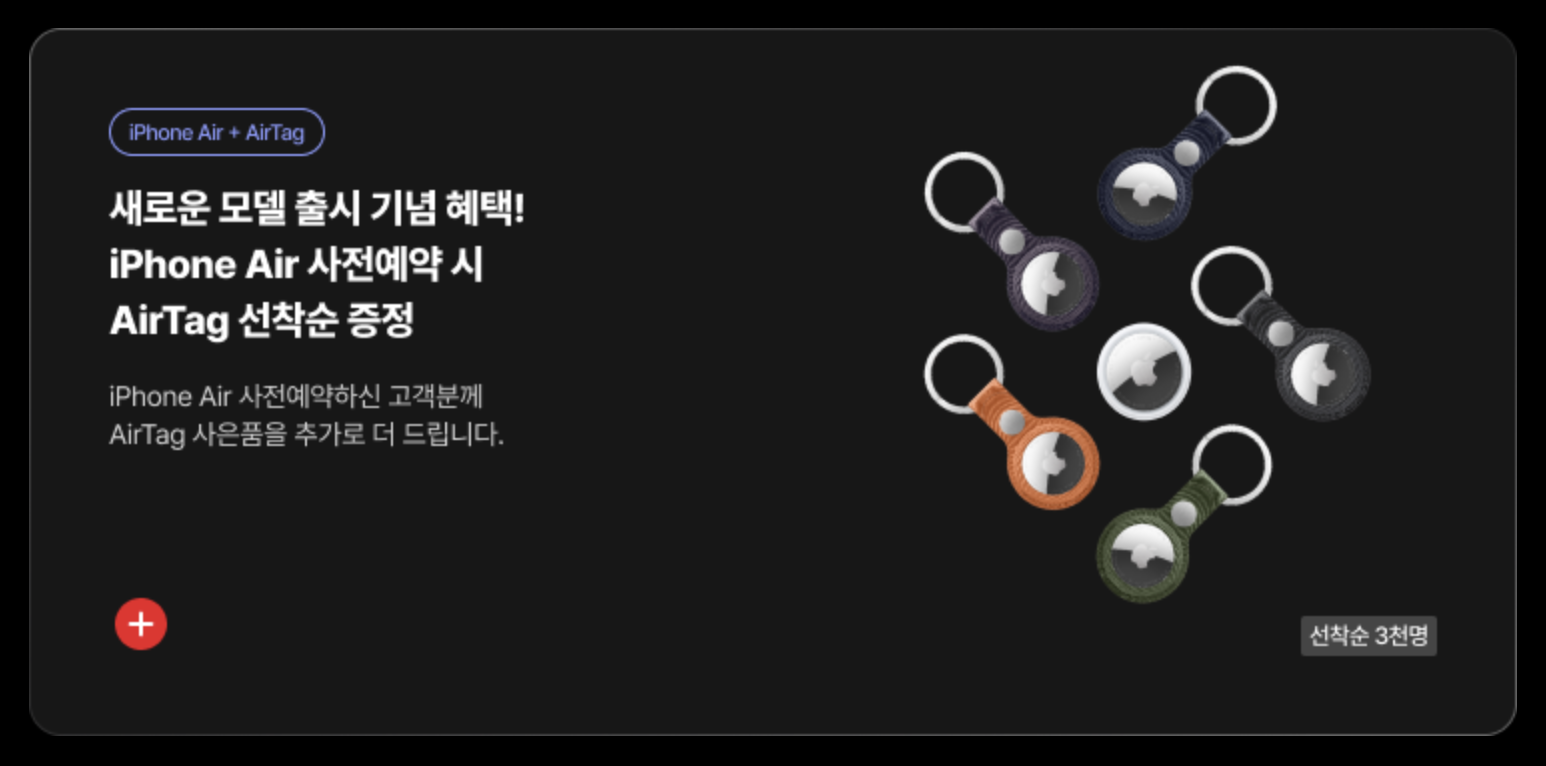 KT닷컴 아이폰17 사전예약을 하면 활용도 좋은 에어태그를 제공합니다. 한국에서도 나의 찾기 서비스가 제대로 지원되면서 에어태그 활용도가 크게 올라갔는데요. 아이폰17 시리즈와 사용하시면 정말 감동하게 되실 것입니다. 에어태그는 선착순 3000명 한정으로 제공됩니다. 이것도 서두르셔야 합니다.