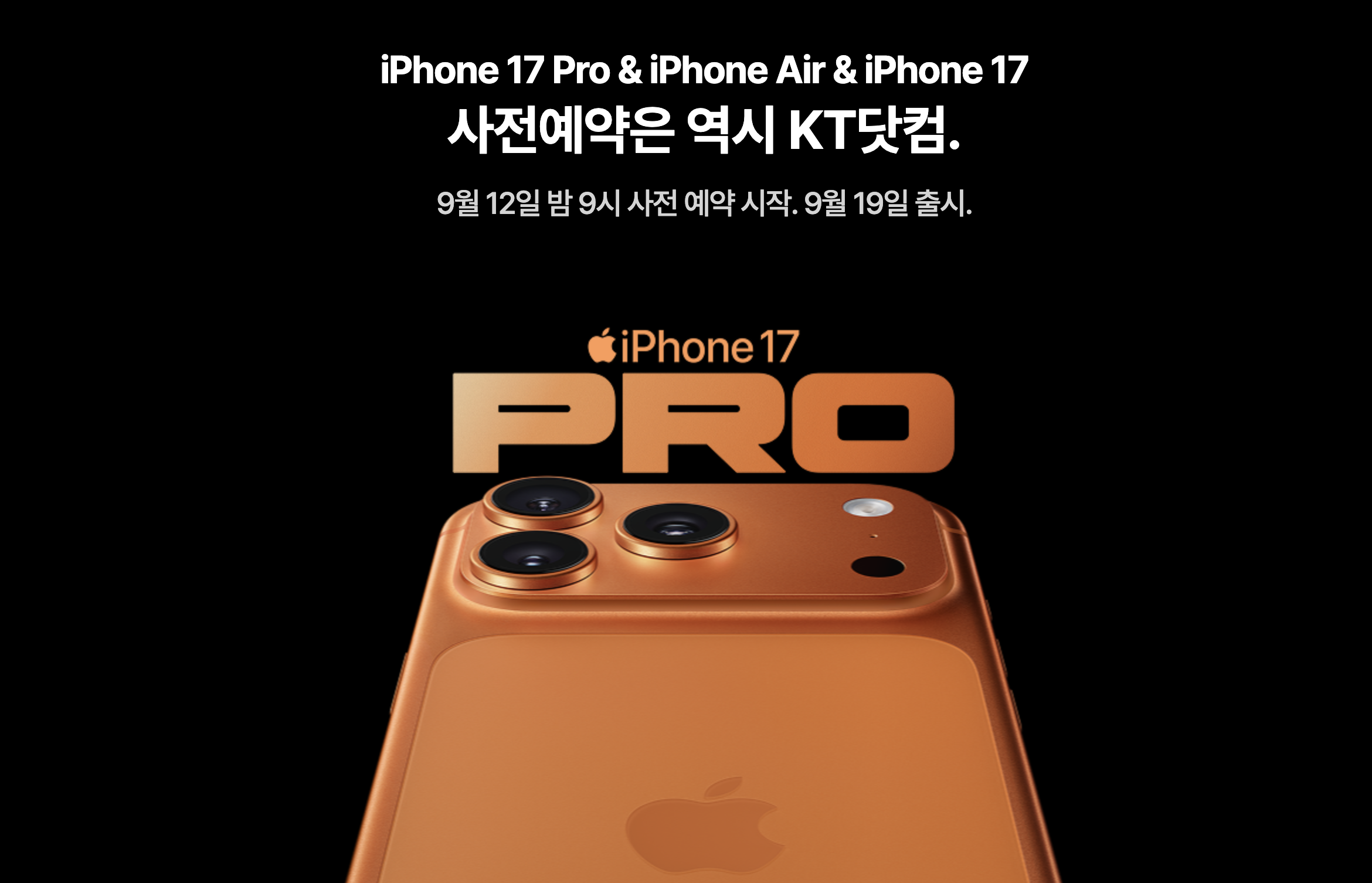 iPhone 17 Pro & iPhone 17 Pro Max & iPhone 17 & iPhone Air 사전예약은 역시 KT닷컴. 50% 미리보상에 추가 할인까지!
