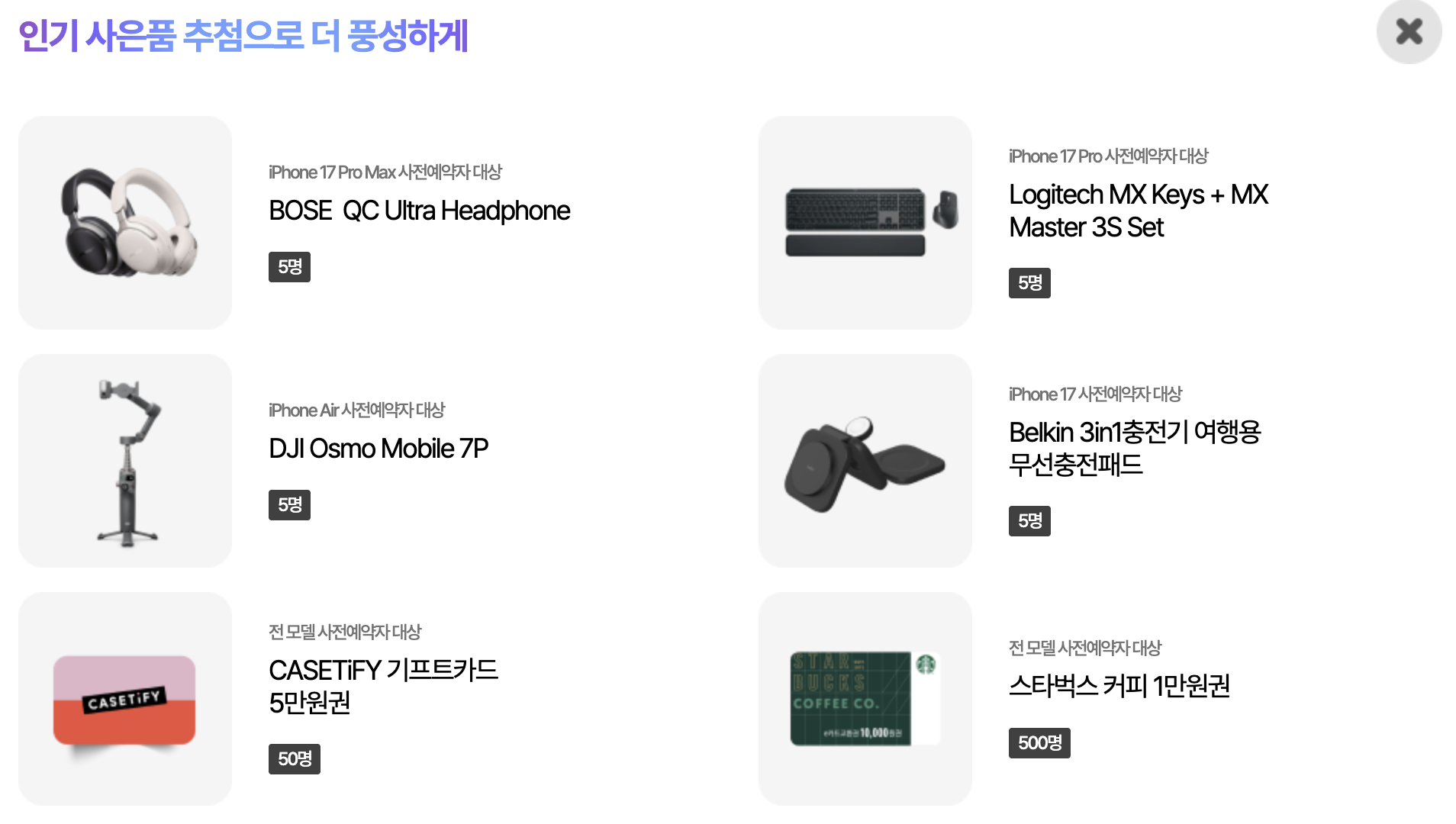 KT닷컴 아이폰17 사전예약자 중 추첨을 통해 570명을 뽑아 선물을 제공합니다. 상품이 실용적이고 당첨자가 많아서 확률이 높은 이벤트이니 기대해 보셔도 좋을 것 같습니다.
