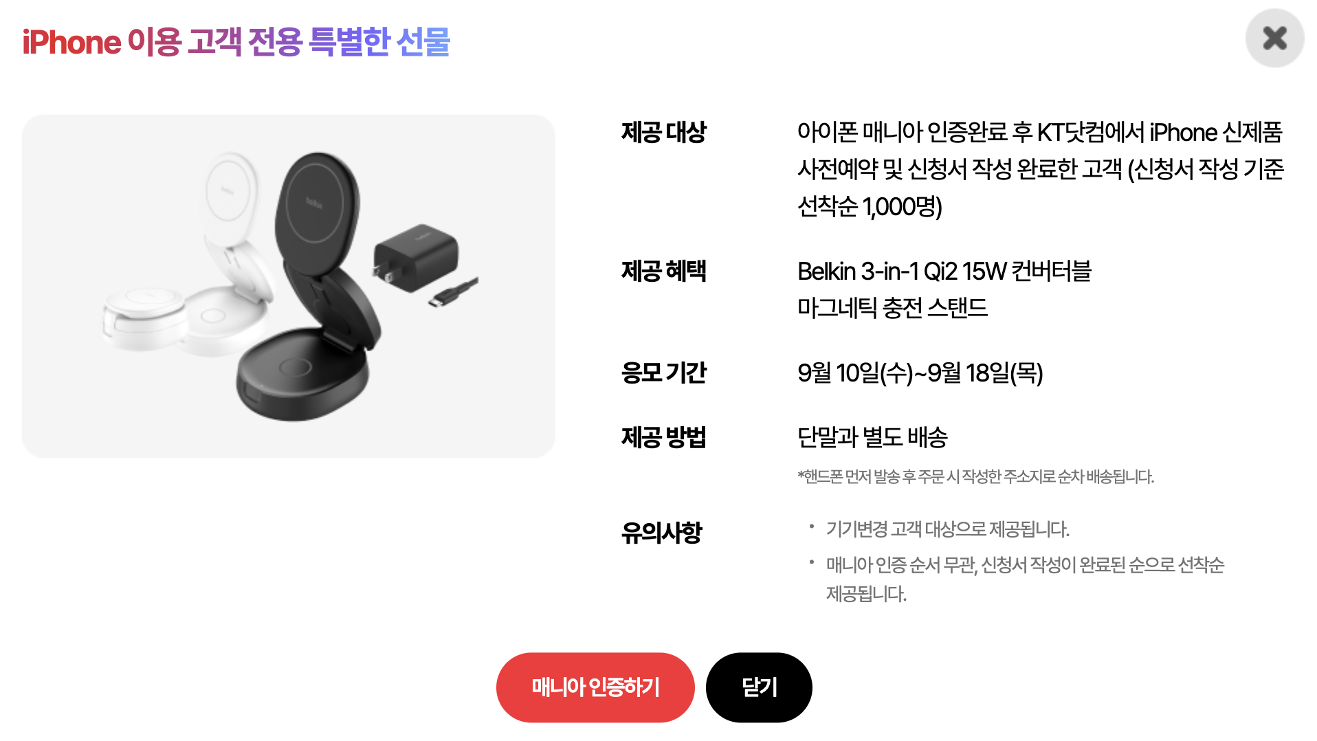 KT닷컴 아이폰17 사전예약에서는 아이폰 매니아를 인증하면 벨킨 3-in-1 Qi2 15W 충전기를 제공하면 아이폰 매니아는 KT에서 아이폰 시리즈를 4회 이상 구매 치 개통한 적이 있는 고객입니다. 물론 대중적인 혜택은 아니라서 아쉽지만 아이폰 사용자들은 매번 교체하는 경우가 많고 KT 사용했던 분들이 많을테니 참고해서 혜택을 보시면 됩니다. 선착순 1,000명 한정으로 제공되는 이벤트입니다.