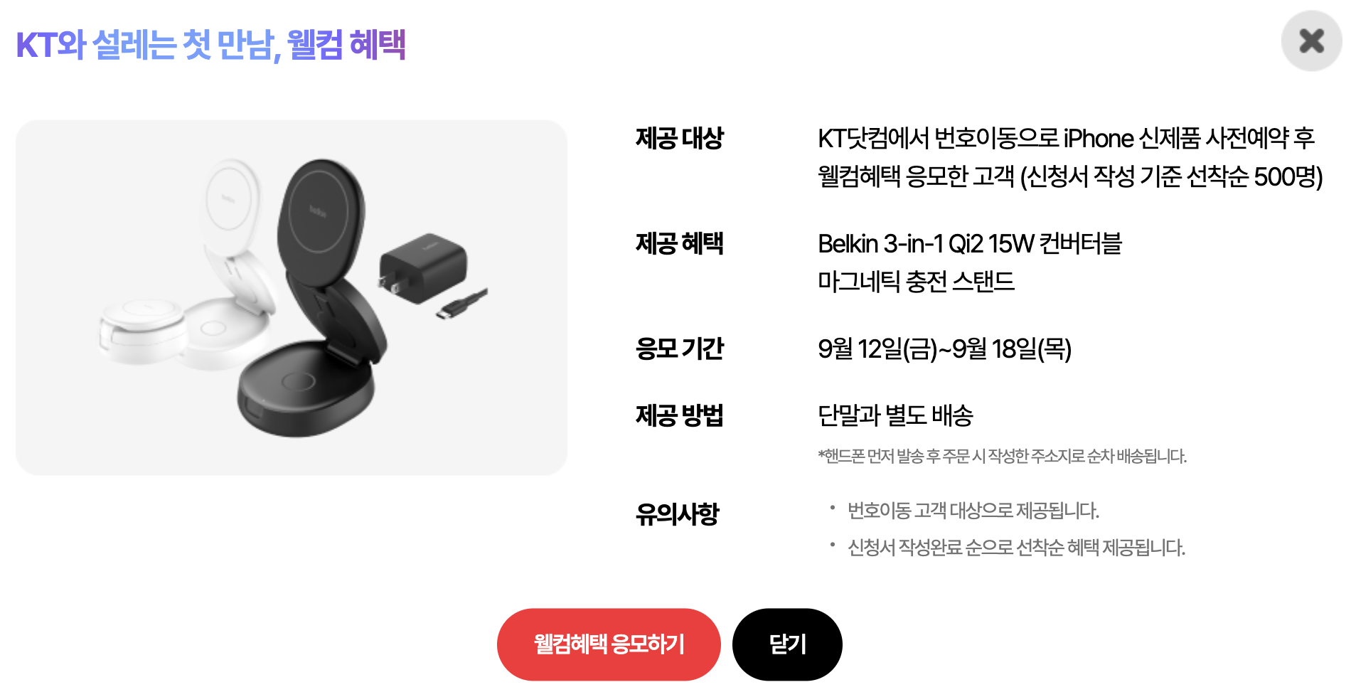 KT닷컴에서 아이폰17 사전예약 후 번호 이동을 하시면 웰컴혜택으로 벨킨 3-in-1 Qi2 15W 충전기를 제공합니다. 새로 개통할 때 번호 이동하는 분들 많은데 좋은 기회가 되겠네요. 선착순 500명에게 제공되는 혜택이니 서두르셔야 합니다.