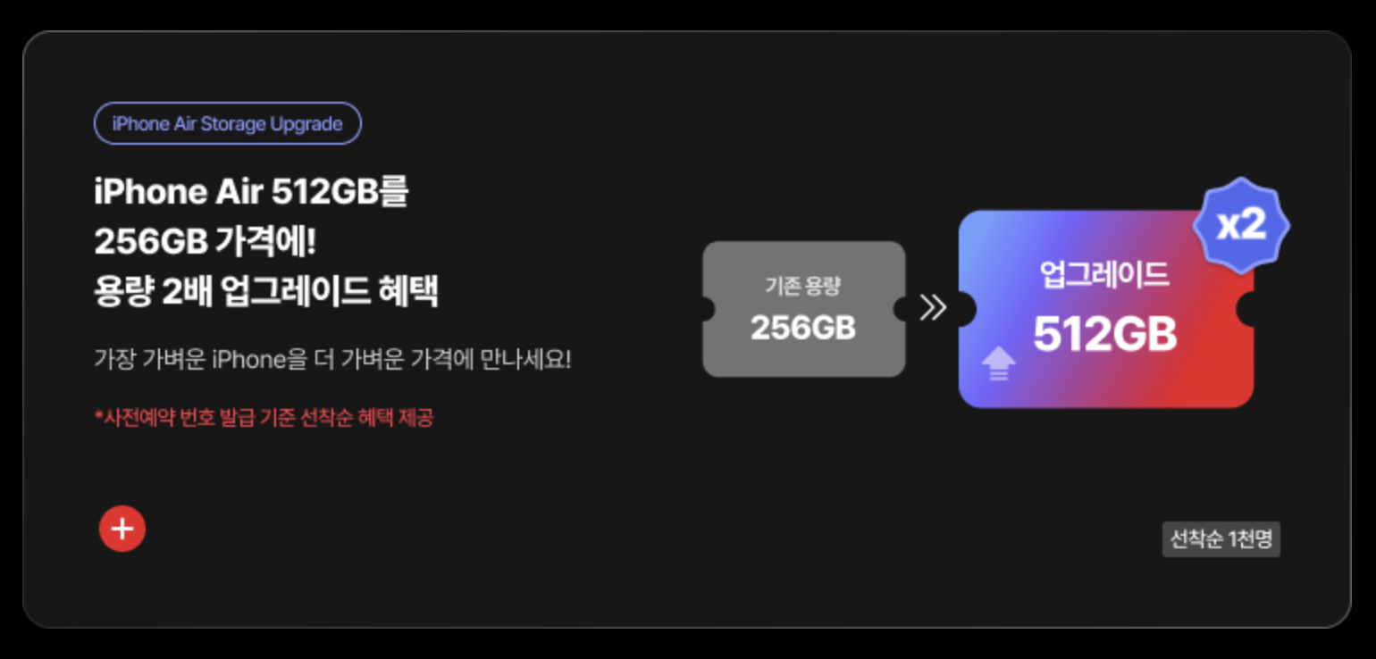 아이폰 에어 구입을 고려하시는 분들은 KT닷컴 아이폰17 사전예약시 256GB로 예약하면 512GB로 업그레이드되는 용량 두 배 혜택이 선착순 1천 명에게 제공됩니다. 요즘은 스마트폰 사진을 많이 찍다보니 용량 부족을 느끼는 분들이 많은데요. 이왕이면 512GB로 사용하면 더 편하게 사용할 수 있으니 좋은 선택지입니다.