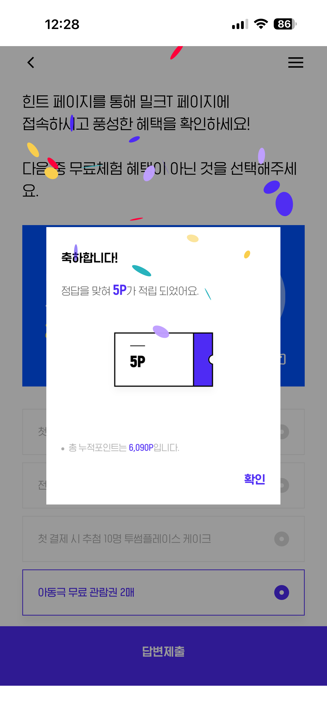 천재교과서 밀크T 무료체험 10일 이벤트 밀크T 첫 무료체험하면 체험자 전원에게 현대모바일상품권 2만원을 드립니다! 힌트 페이지를 통해 밀크T 페이지에 접속하시고 풍성한 혜택을 확인하세요! 다음 중 무료체험 혜택이 아닌 것을 선택해주세요 보기는 1. 첫 체험 시 H.Point 상품권 2만원 2. 전학년 전과목 무료체험 10일 3. 첫 결제 시 추첨 10명 투썸플레이스 케이크 4. 아동극 무료 관람권 2매