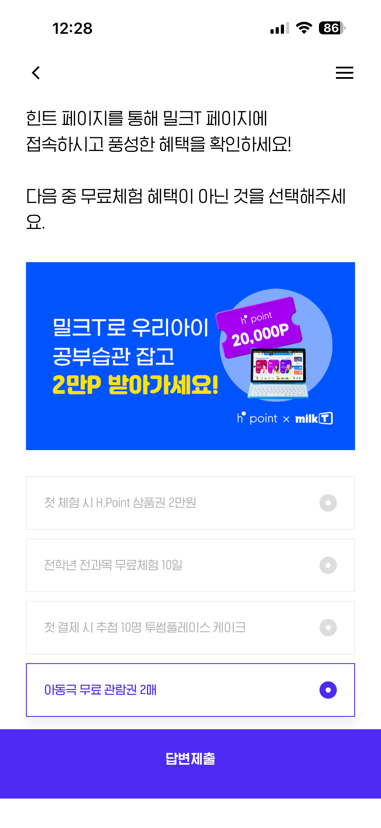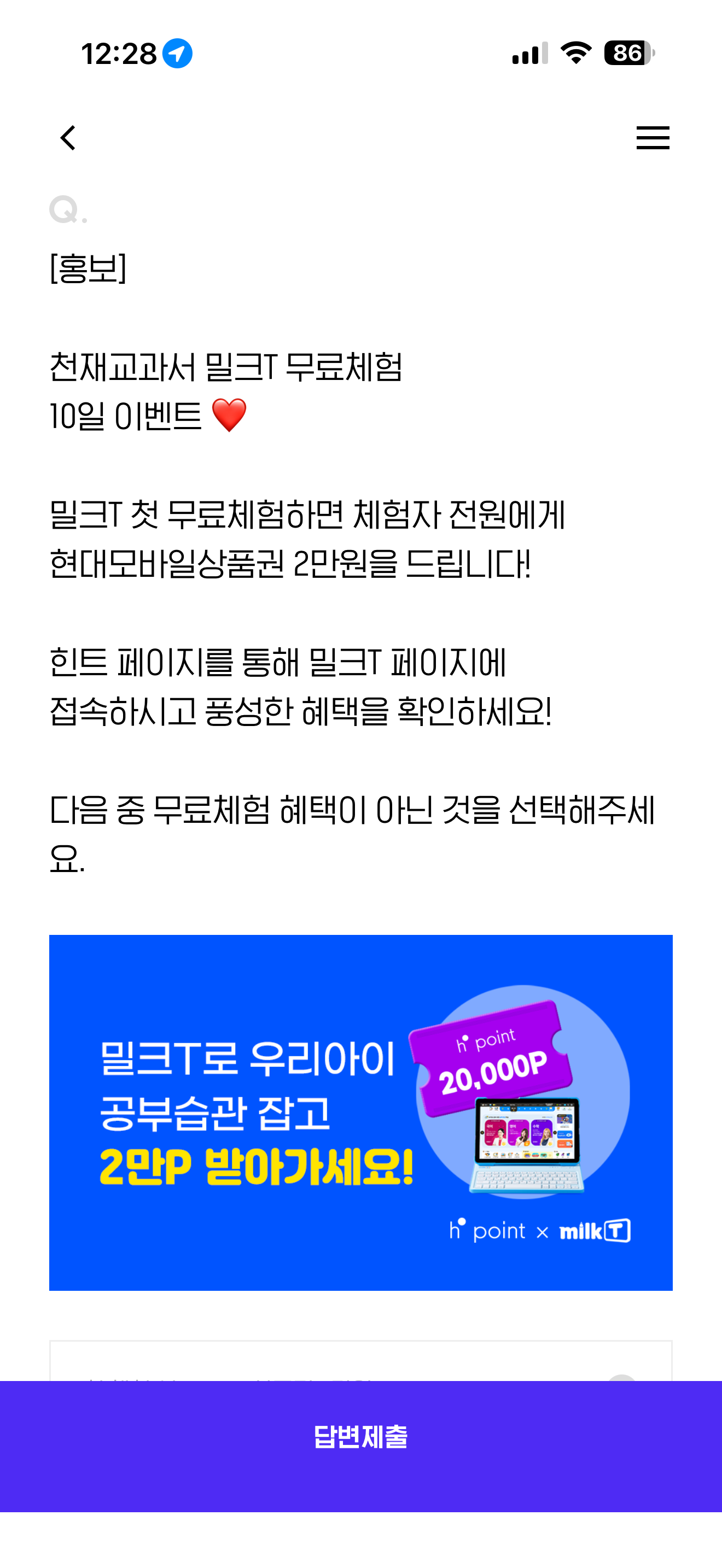 천재교과서 밀크T 무료체험 10일 이벤트 밀크T 첫 무료체험하면 체험자 전원에게 현대모바일상품권 2만원을 드립니다! 힌트 페이지를 통해 밀크T 페이지에 접속하시고 풍성한 혜택을 확인하세요! 다음 중 무료체험 혜택이 아닌 것을 선택해주세요 보기는 1. 첫 체험 시 H.Point 상품권 2만원 2. 전학년 전과목 무료체험 10일 3. 첫 결제 시 추첨 10명 투썸플레이스 케이크 4. 아동극 무료 관람권 2매