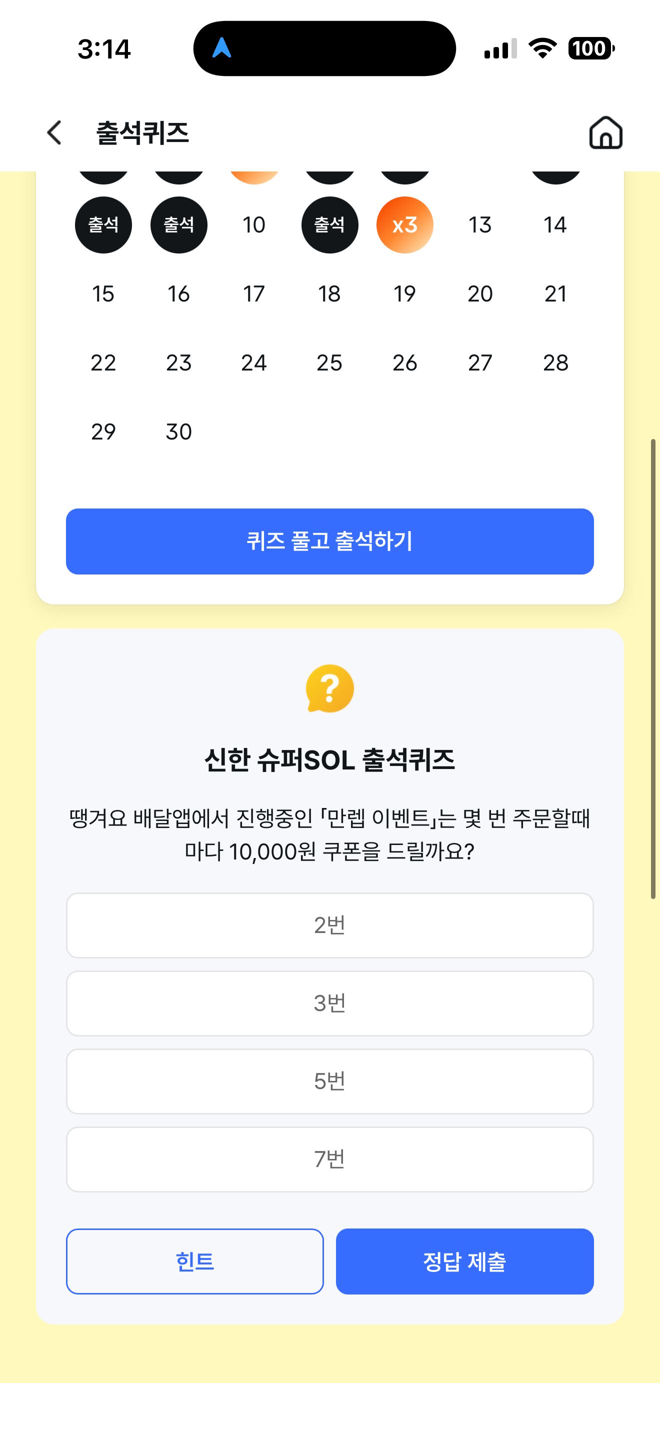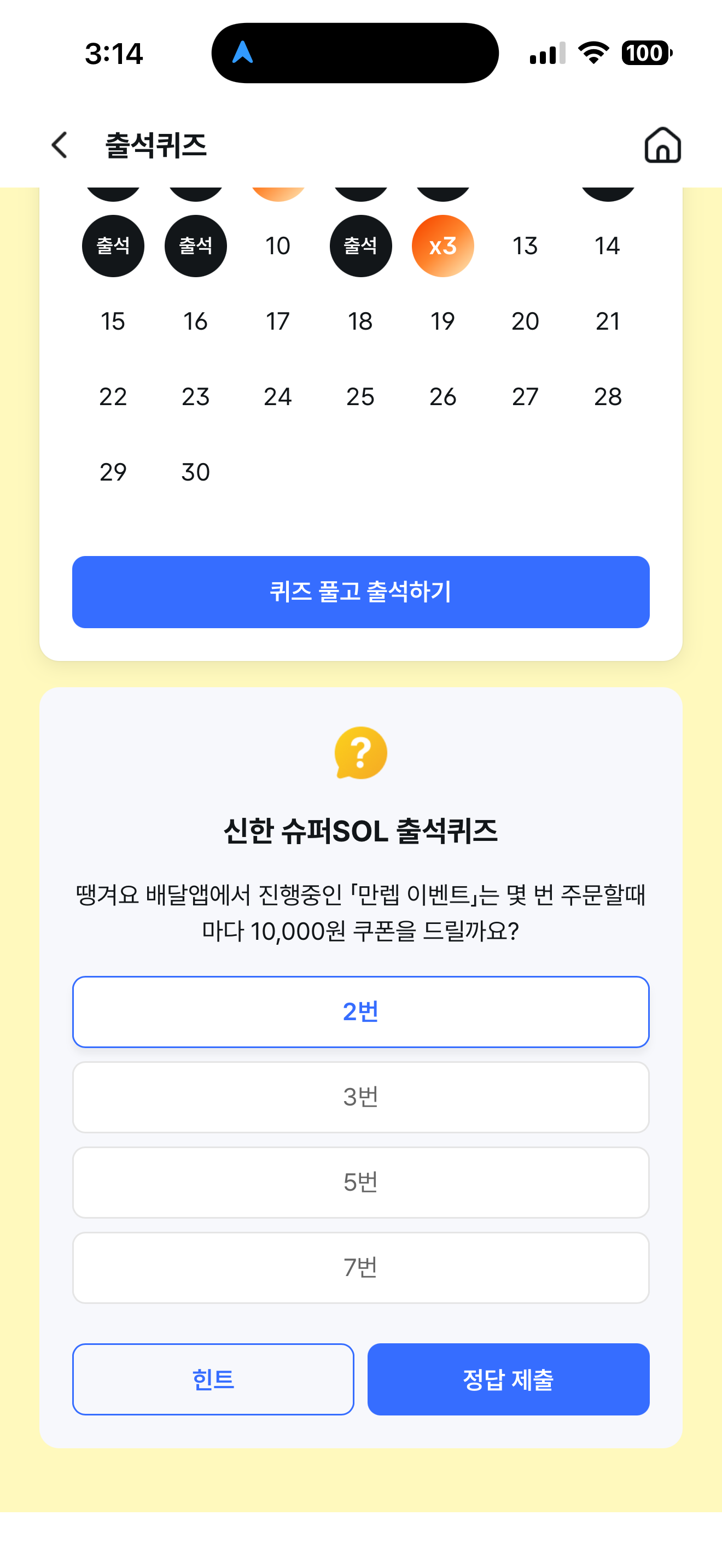 신한 슈퍼SOL 출석퀴즈 정답은 2번 입니다