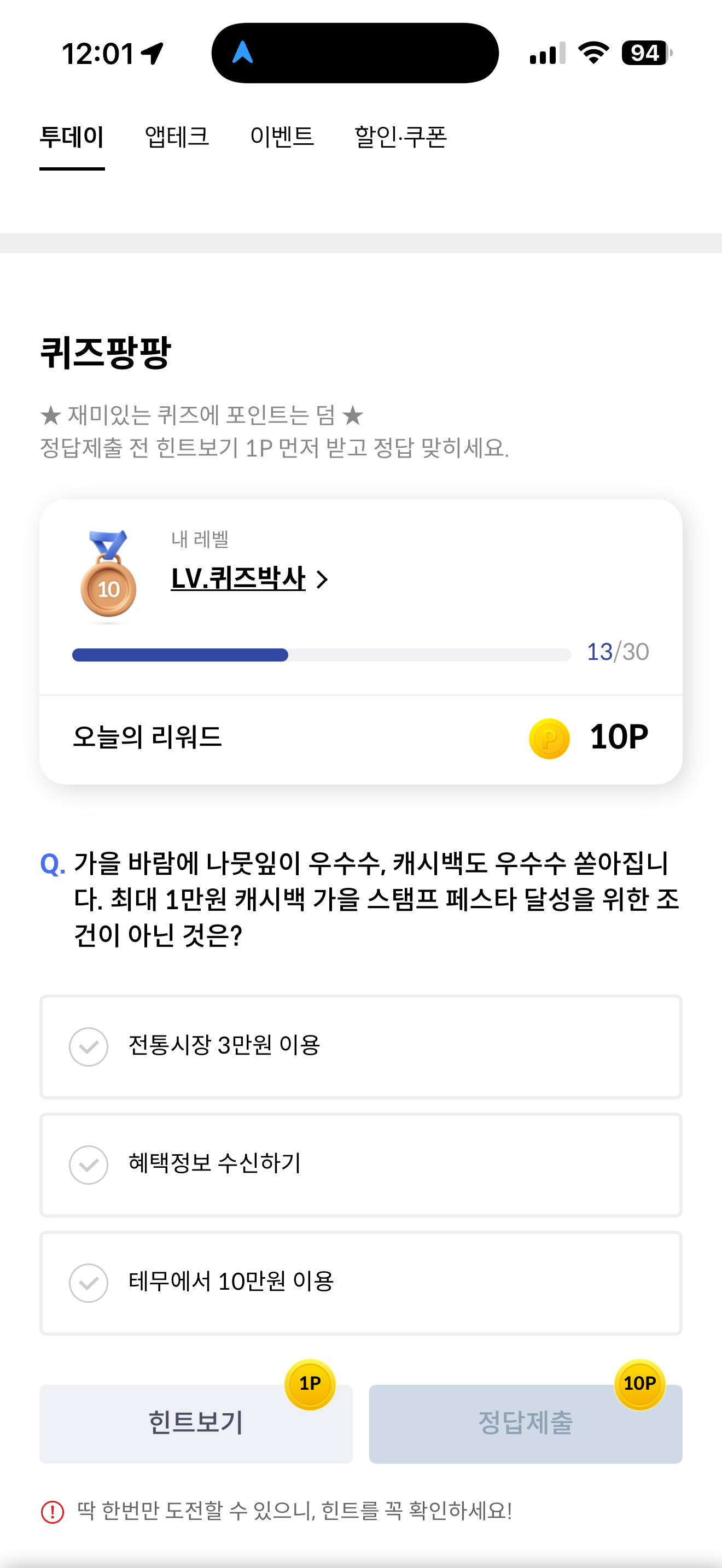 가을 바람에 나뭇잎이 우수수, 캐시백도 우수수 쏟아집니다. 최대 1만원 캐시백 가을 스탬프 페스타 달성을 위한 조건이 아닌 것은? 보기는 1. 전통시장 3만원 이용 2. 혜택정보 수신하기 3. 테무에서 10만원 이용 입니다.