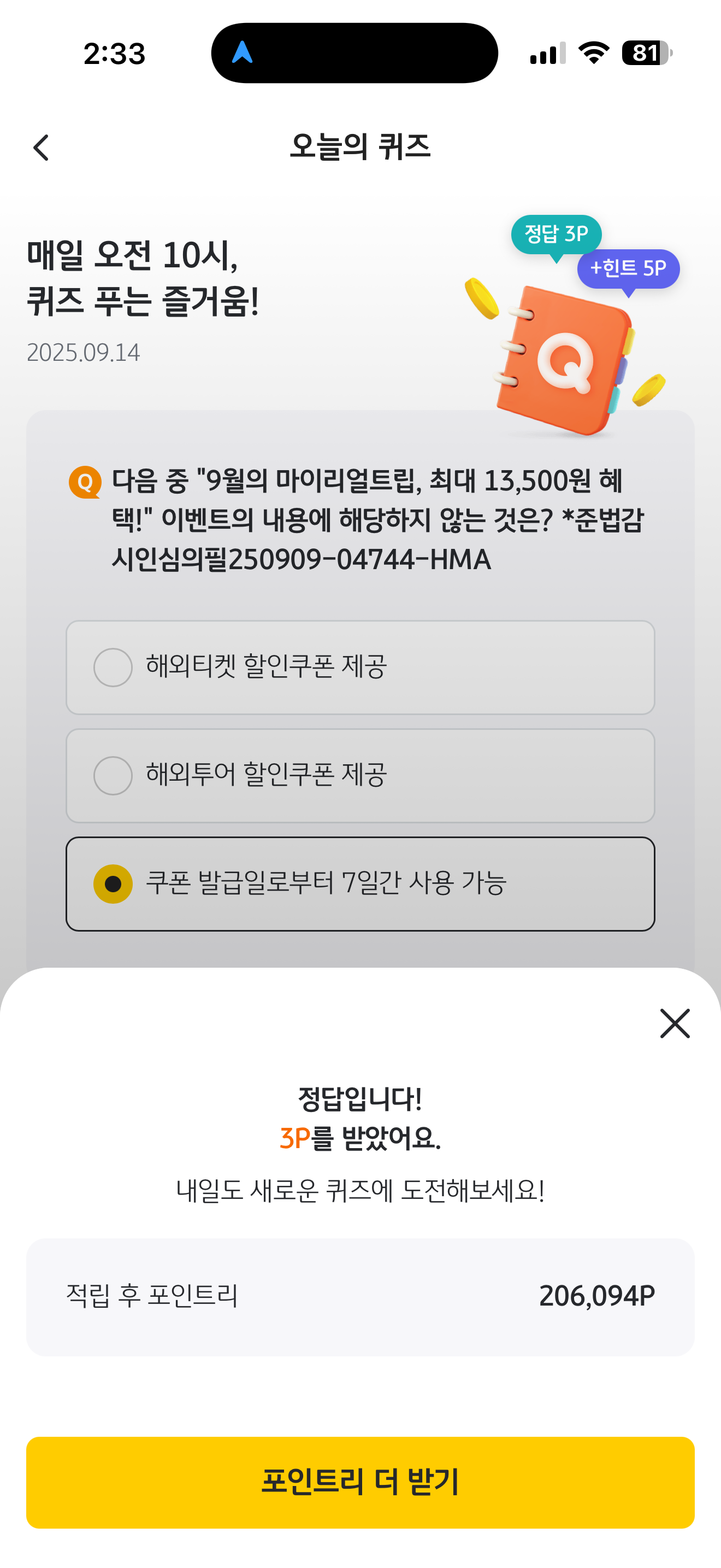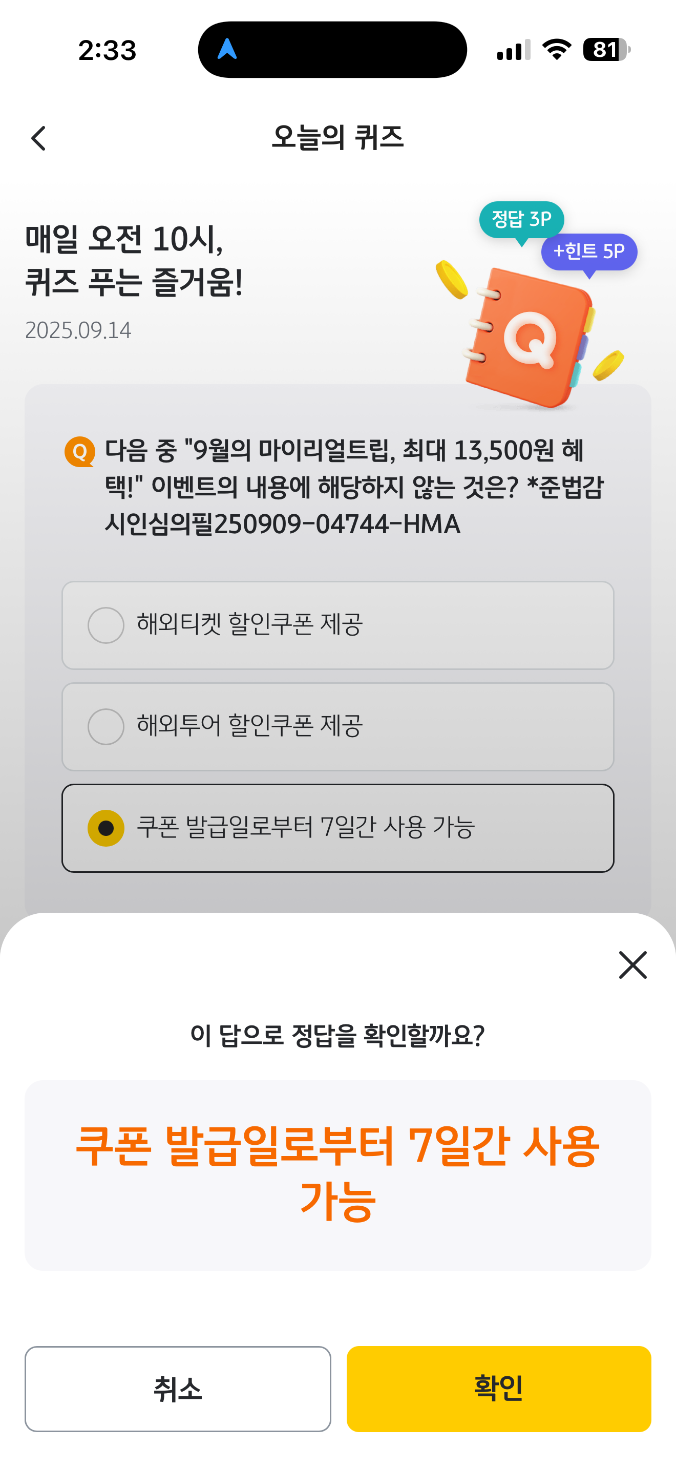 KB Pay 오늘의 퀴즈 9월 14일 정답(다음 중 "9월의 마이리얼트립, 최대 13,500원 혜택!" 이벤트의 내용에 해당하지 않는 것은?)