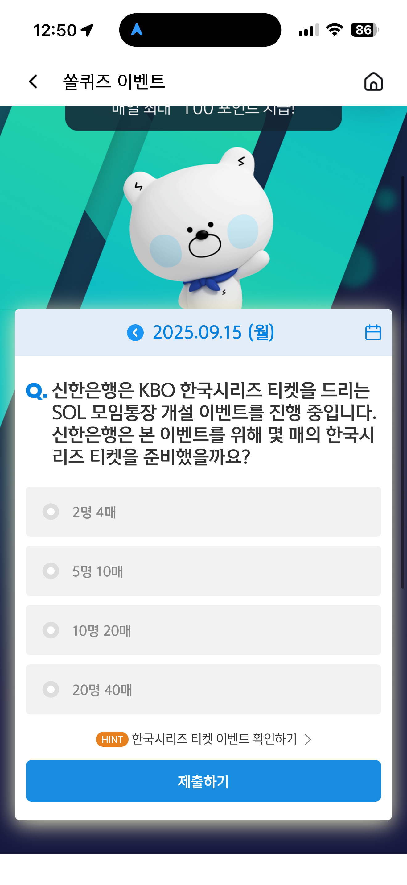 신한 슈퍼SOL 야구/상식 쏠퀴즈 정답은 20명 40매 입니다