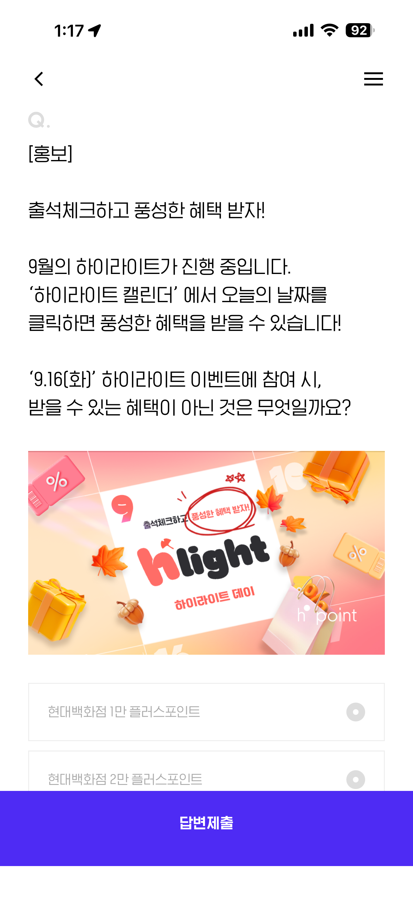 출석체크하고 풍성한 혜택 받자! 9월의 하이라이트가 진행 중입니다. '하이라이트 캘린더' 에서 오늘의 날짜를 클릭하면 풍성한 혜택을 받을 수 있습니다! '9.16(화)' 하이라이트 이벤트에 참여 시, 받을 수 있는 혜택이 아닌 것은 무엇일까요? 보기는 1. 현대백화점 1만 플러스포인트 2. 현대백화점 2만 플러스포인트 3. 현대아울렛 커넥트 현대 1만 플러스포인트 4. 베스킨라빈스 아이스크림 파인트 교환권