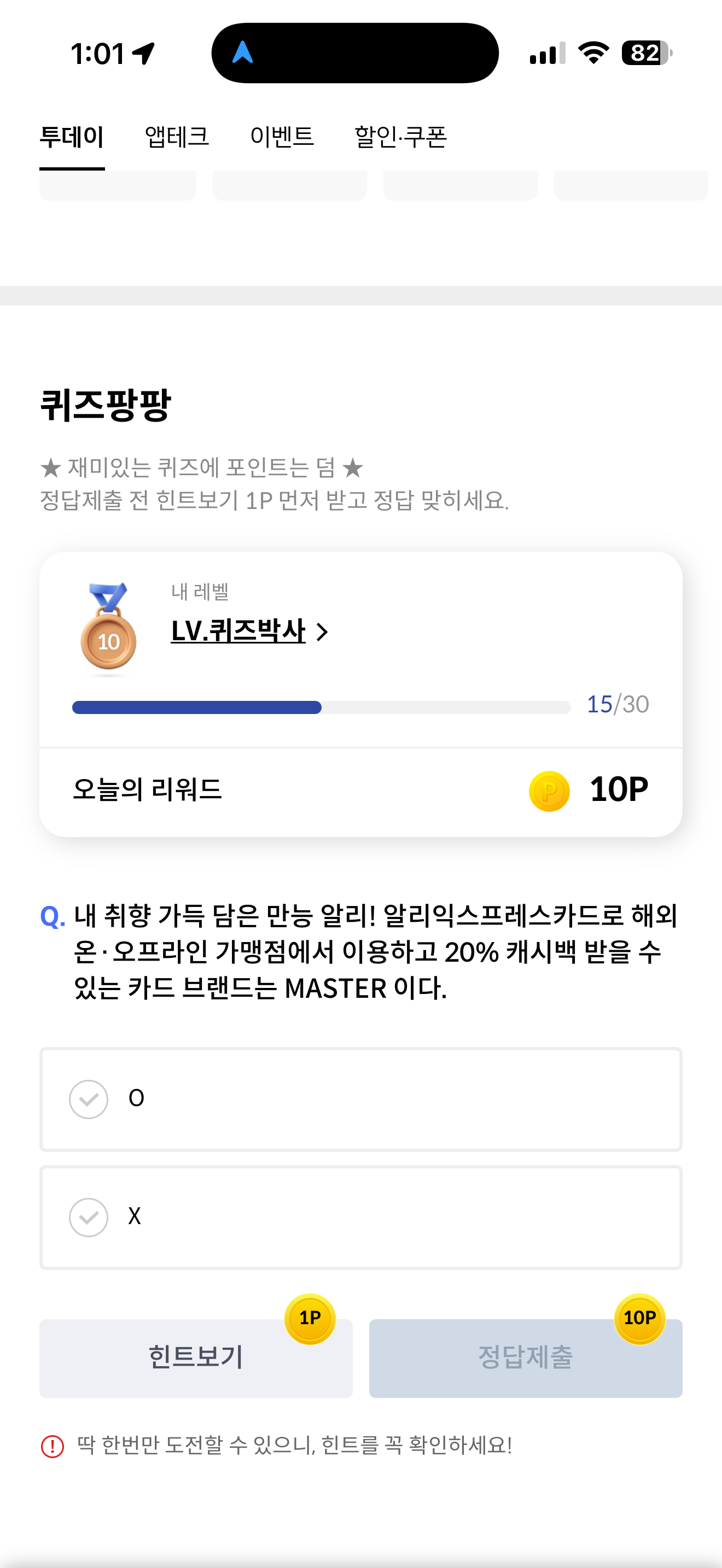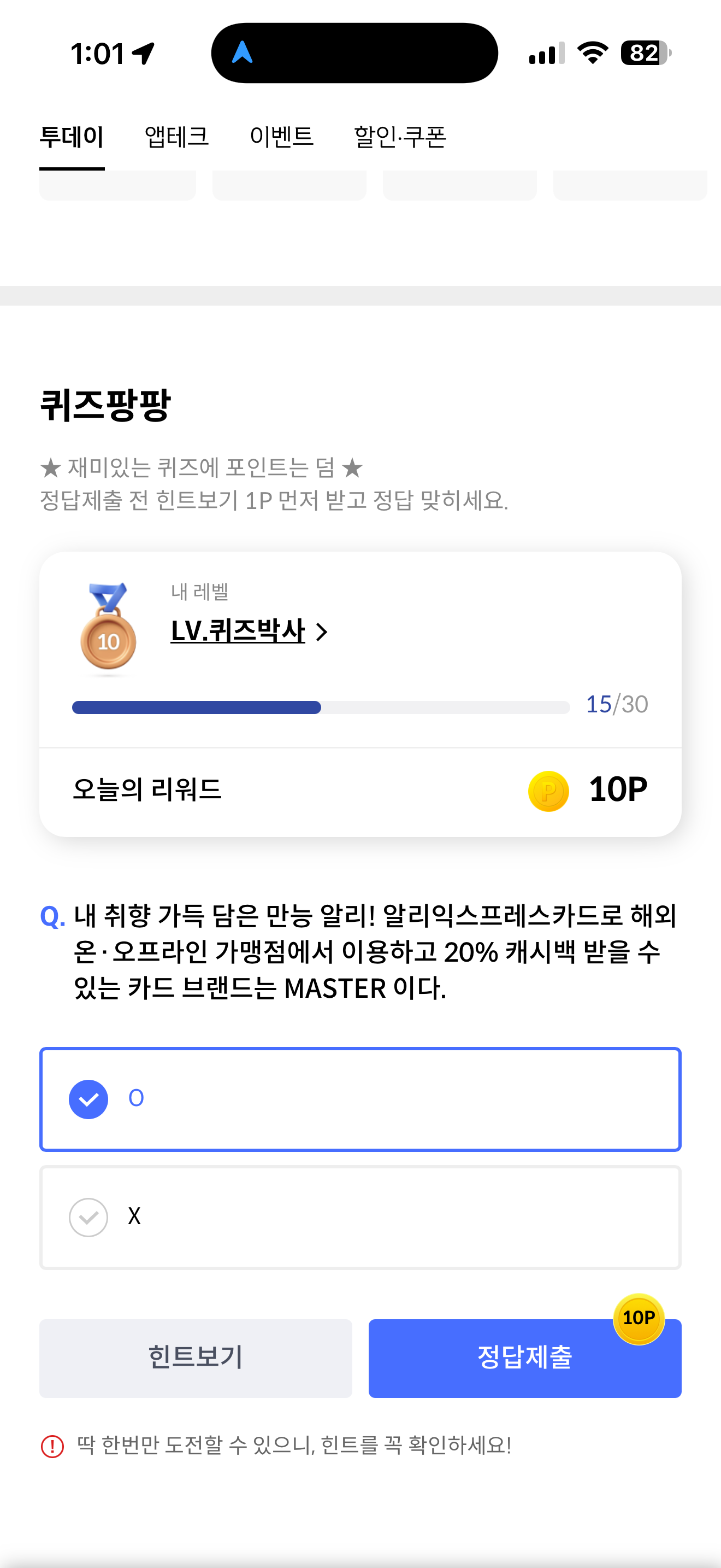 신한카드 퀴즈팡팡 정답은 O 입니다