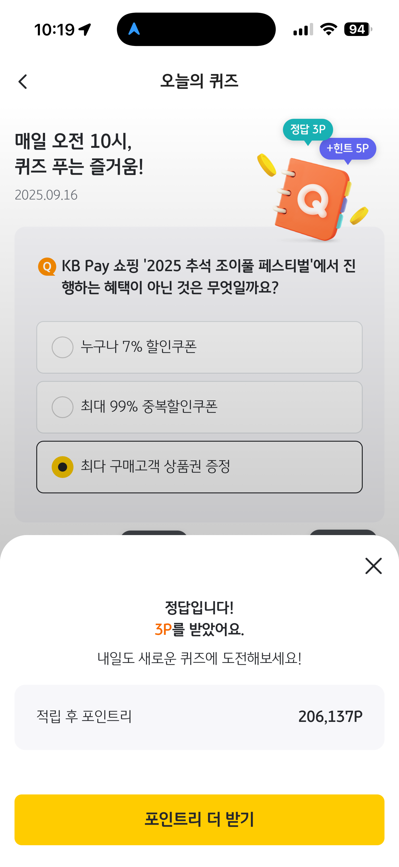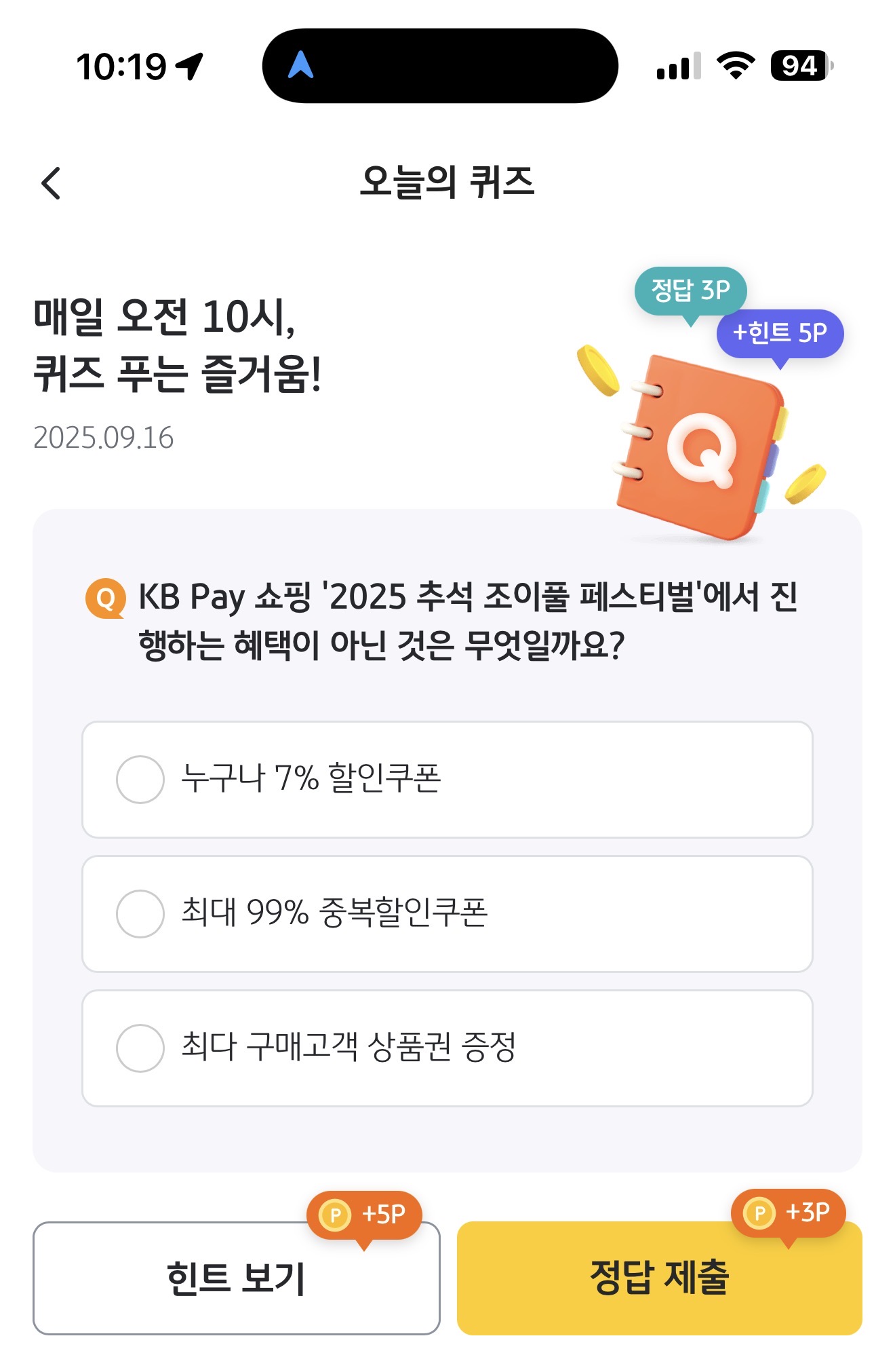 KB Pay 쇼핑 '2025 추석 조이풀 페이스티벌'에서 진행하는 혜택이 아닌 것은 무엇일까요? 보기는 1. 누구나 7% 할인쿠폰 2. 최대 99% 중복할인쿠폰 3. 최다 구매고객 상품권 증정 입니다.