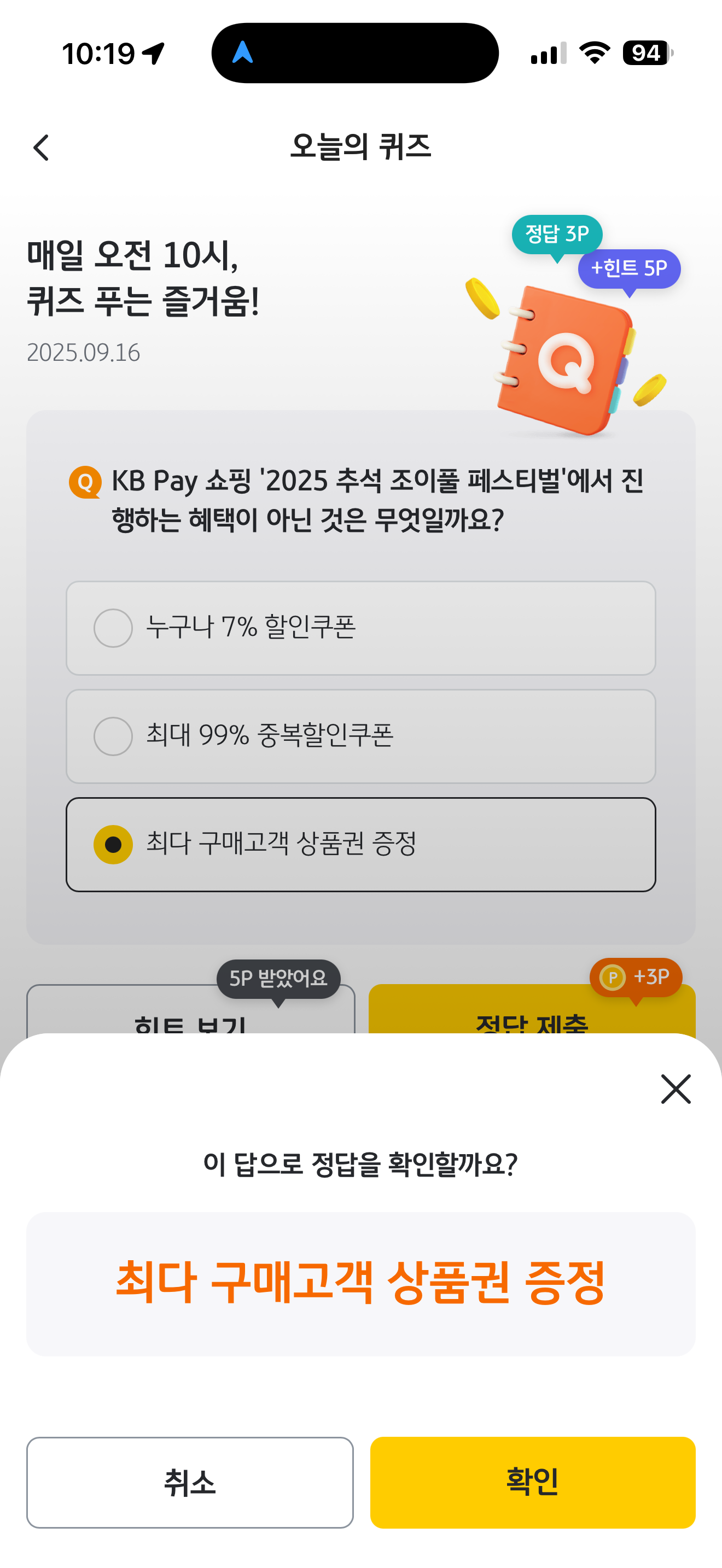 KB Pay 오늘의 퀴즈 정답은 최다 구매고객 상품권 증정 입니다