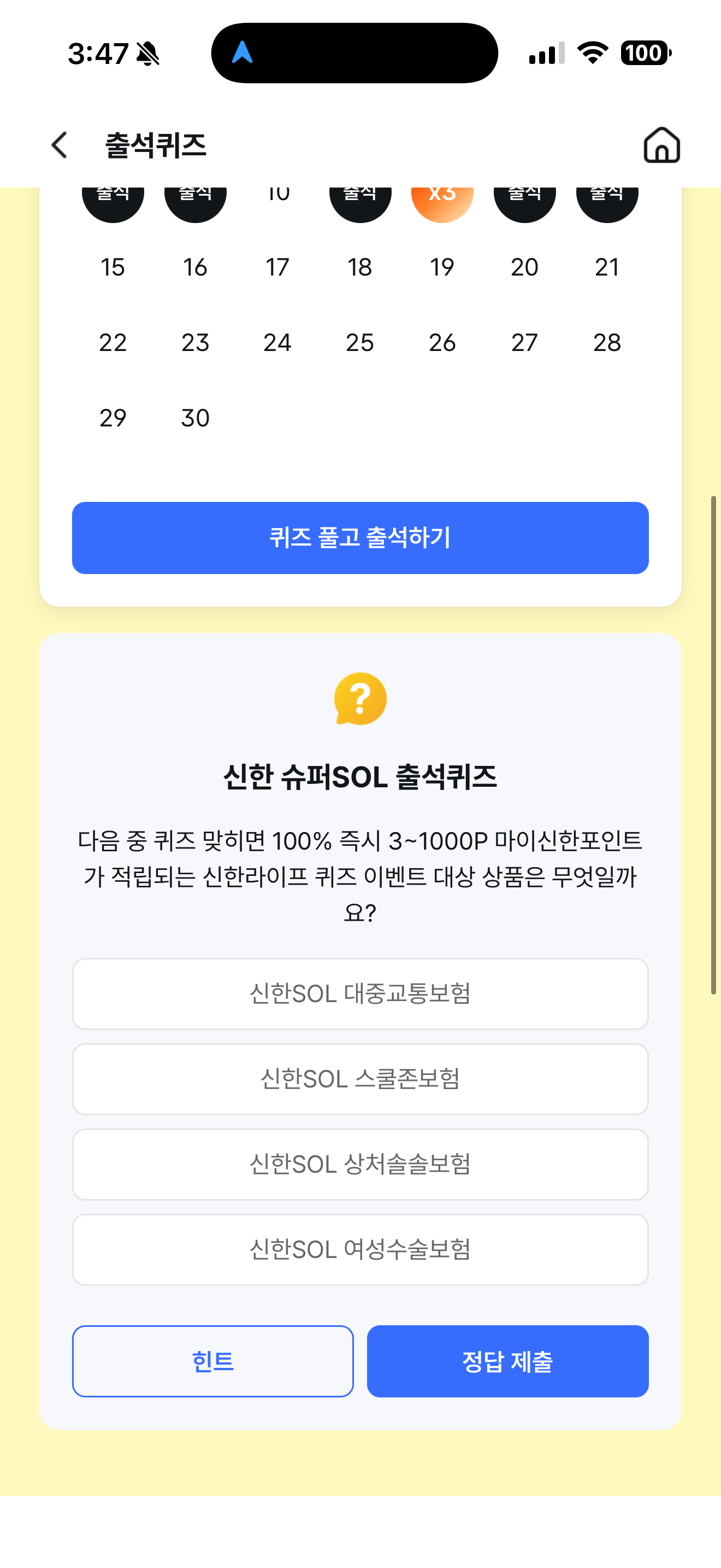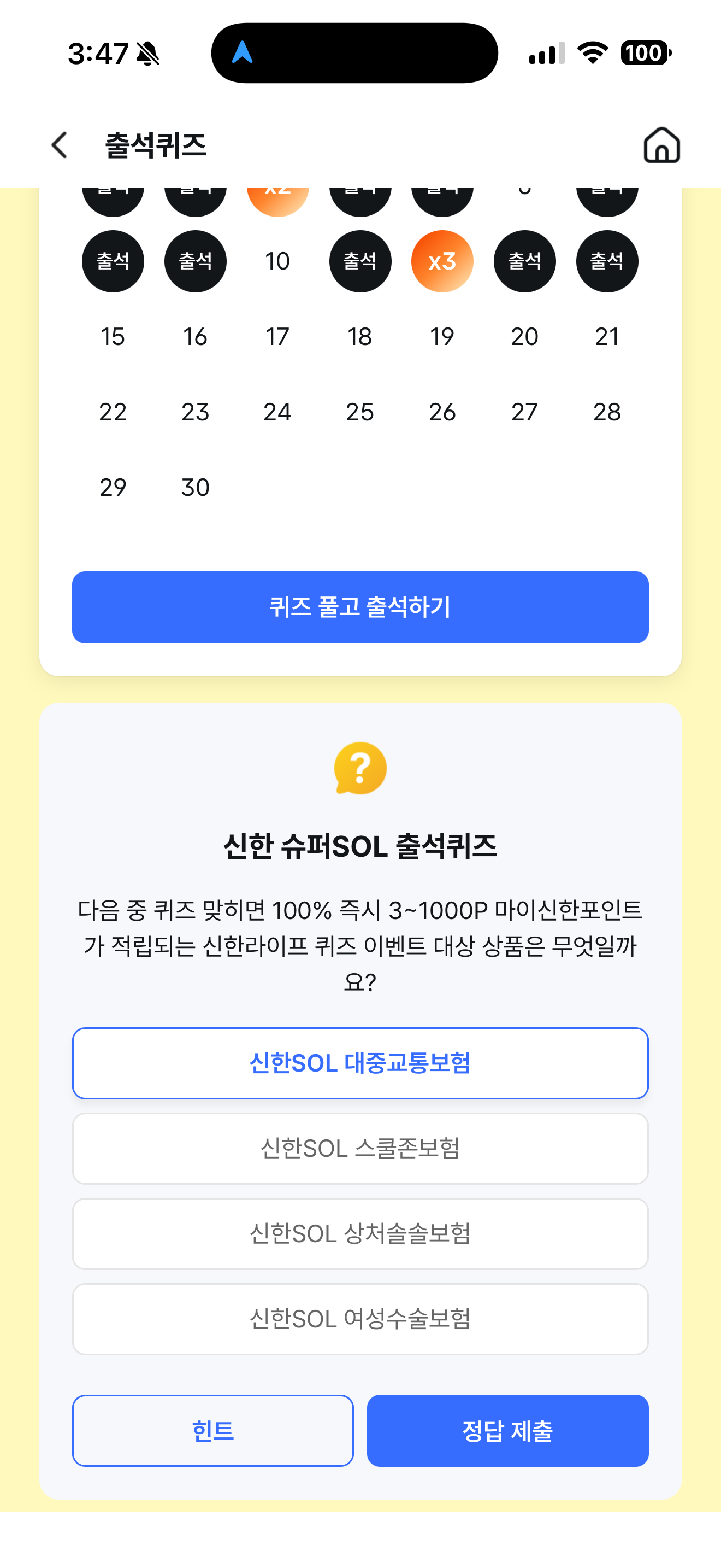 신한 슈퍼SOL 출석퀴즈 정답은 신한SOL 대중교통보험 입니다