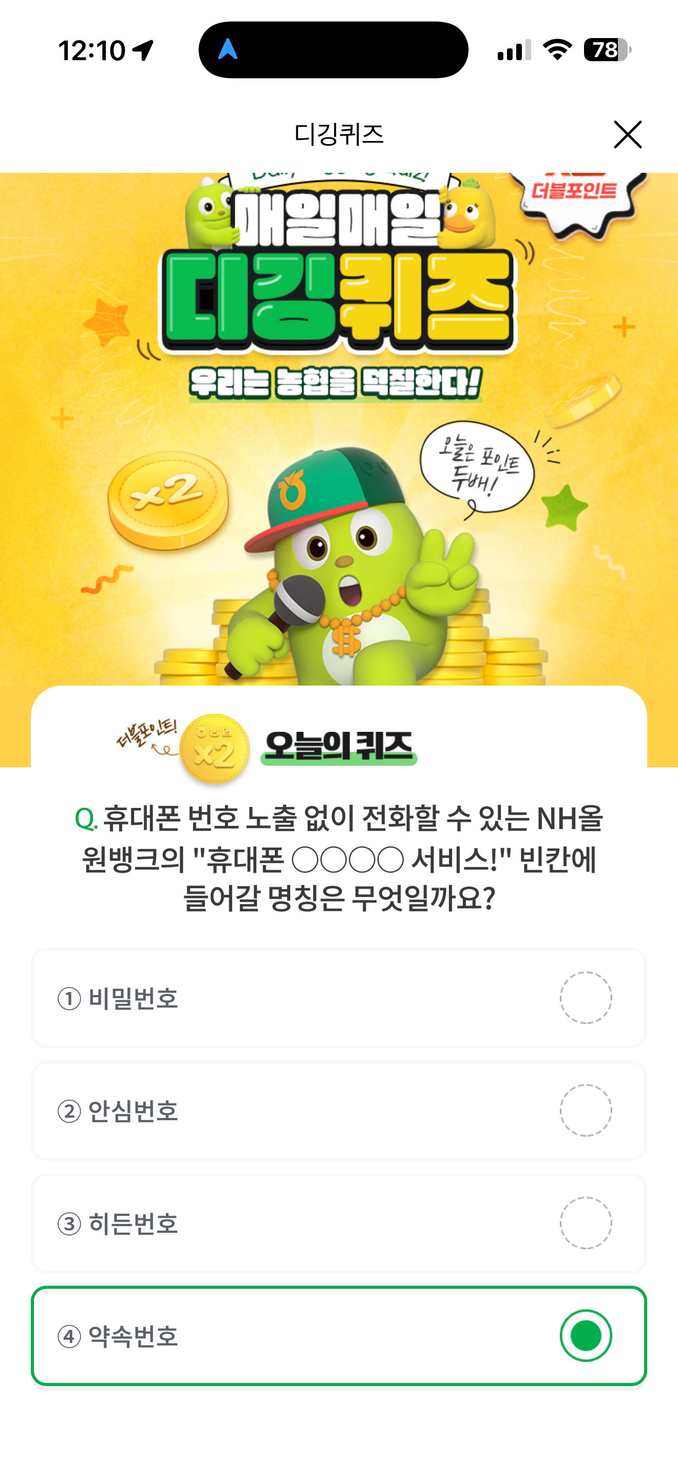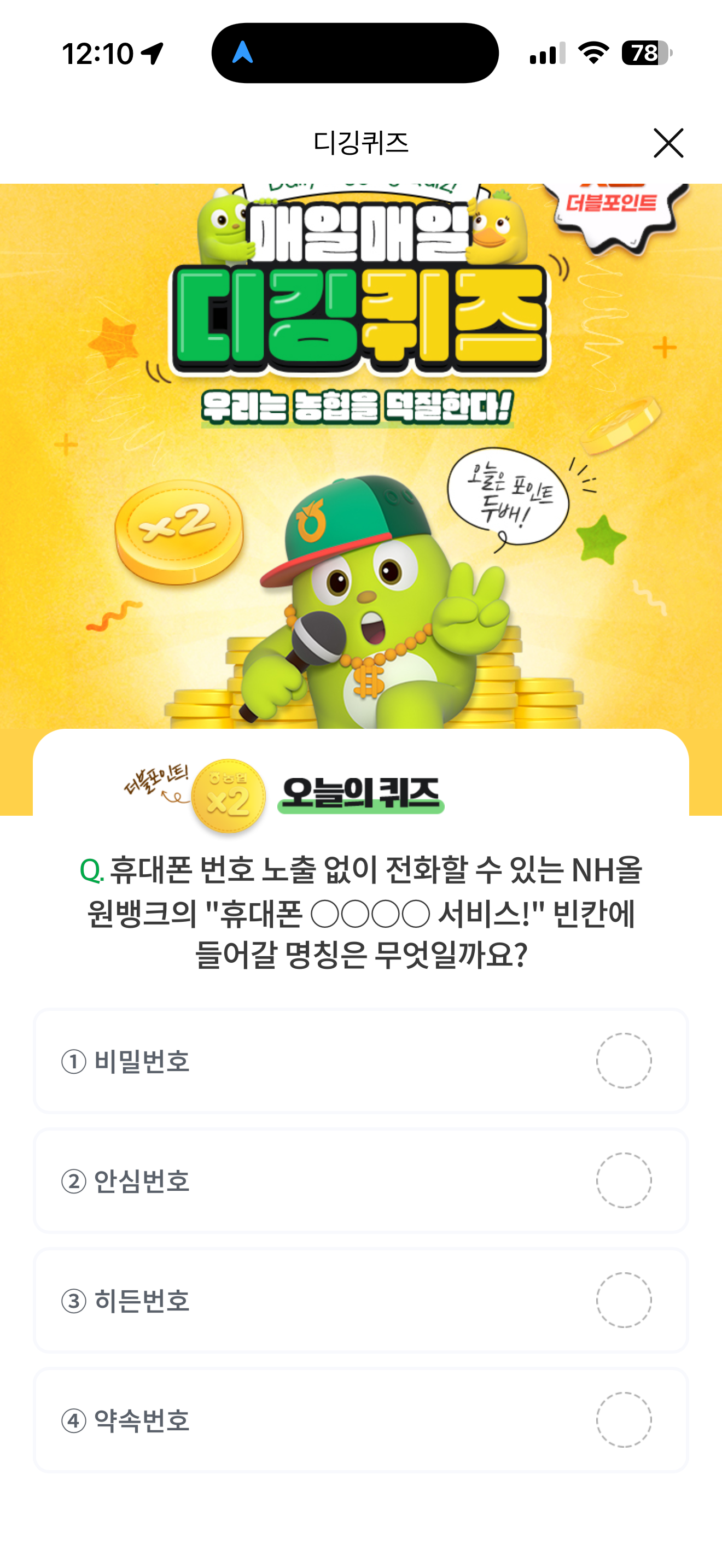 NH올원뱅크 디깅퀴즈 정답은 약속번호 입니다