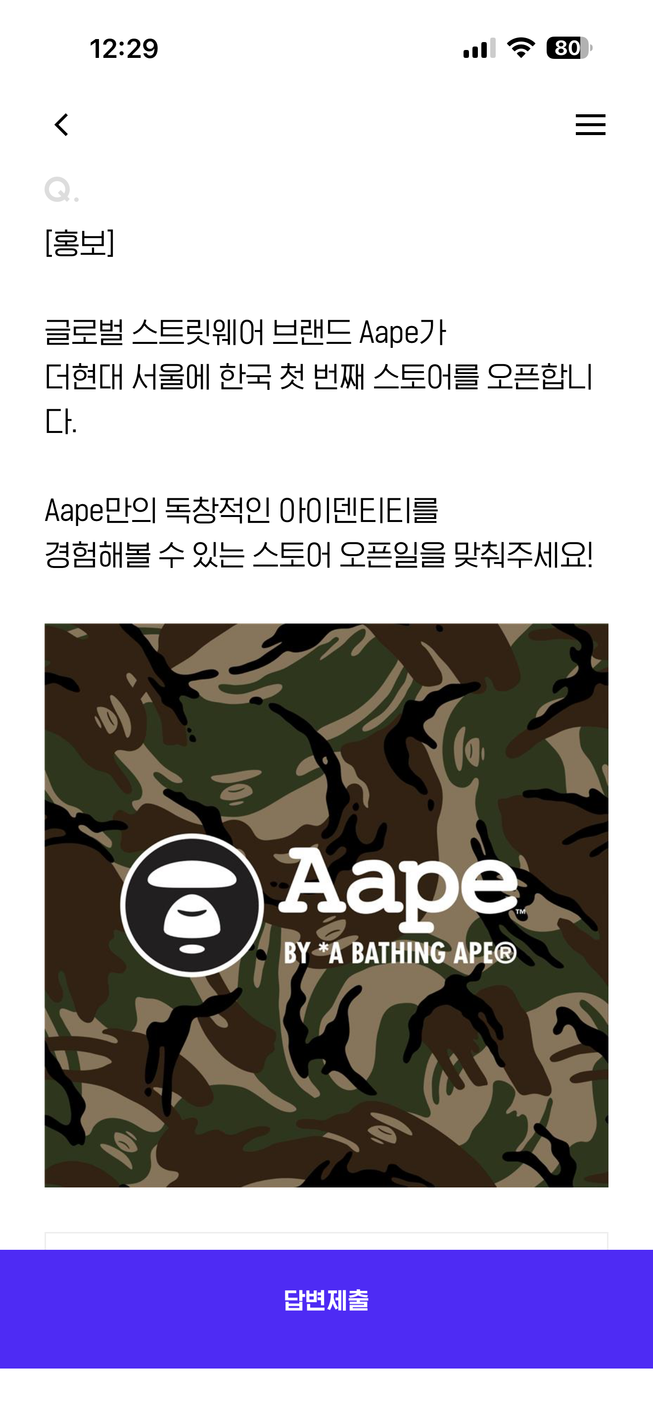 글로벌 스트릿웨어 브랜드 Aape가 더현대 서울에 한국 첫 번째 스토어를 오픈합니다. Aape만의 독창적인 아이덴티티를 경험해볼 수 있는 스토어 오픈일을 맞춰주세요! 보기는 1. 9/25(목) 2. 9/26(금) 3. 9/27(토) 4. 9/28(일) 입니다