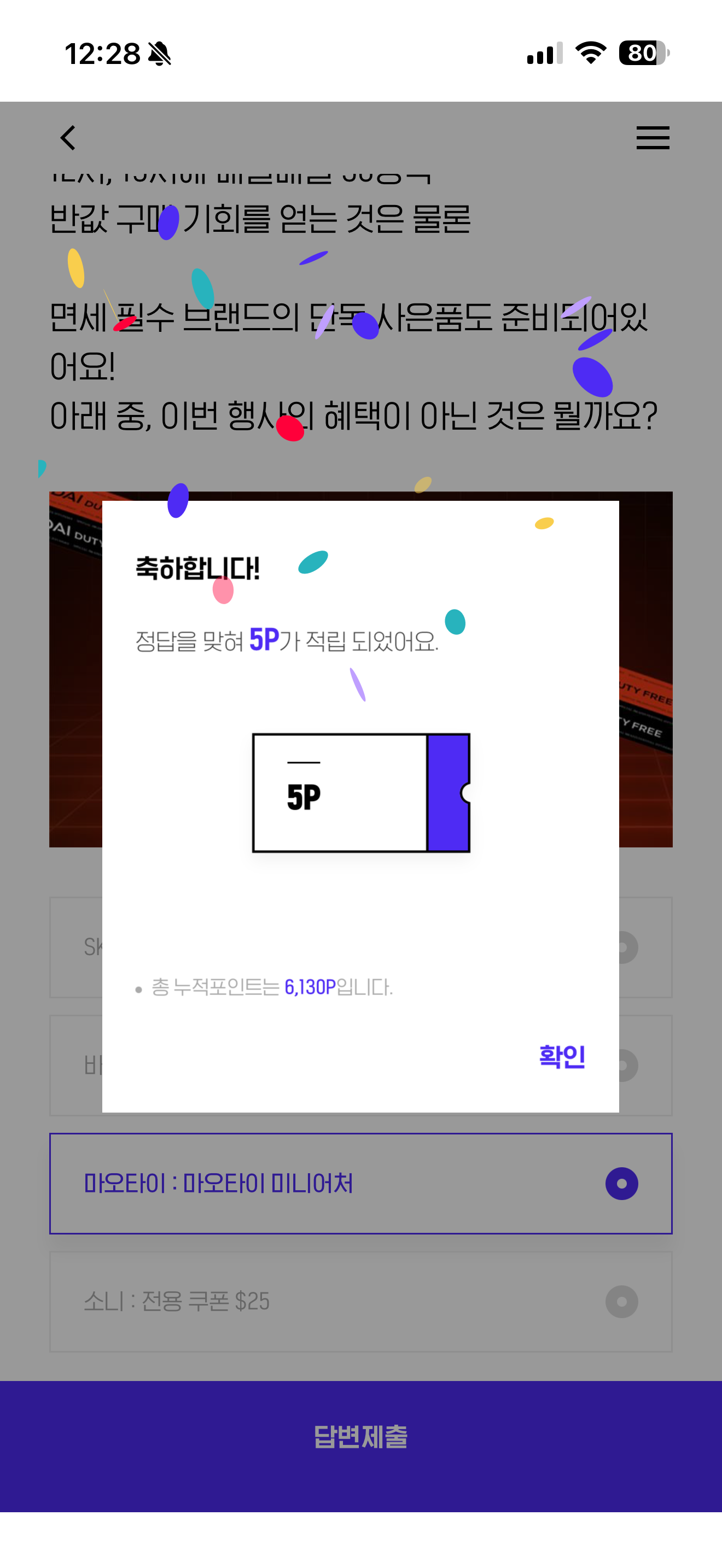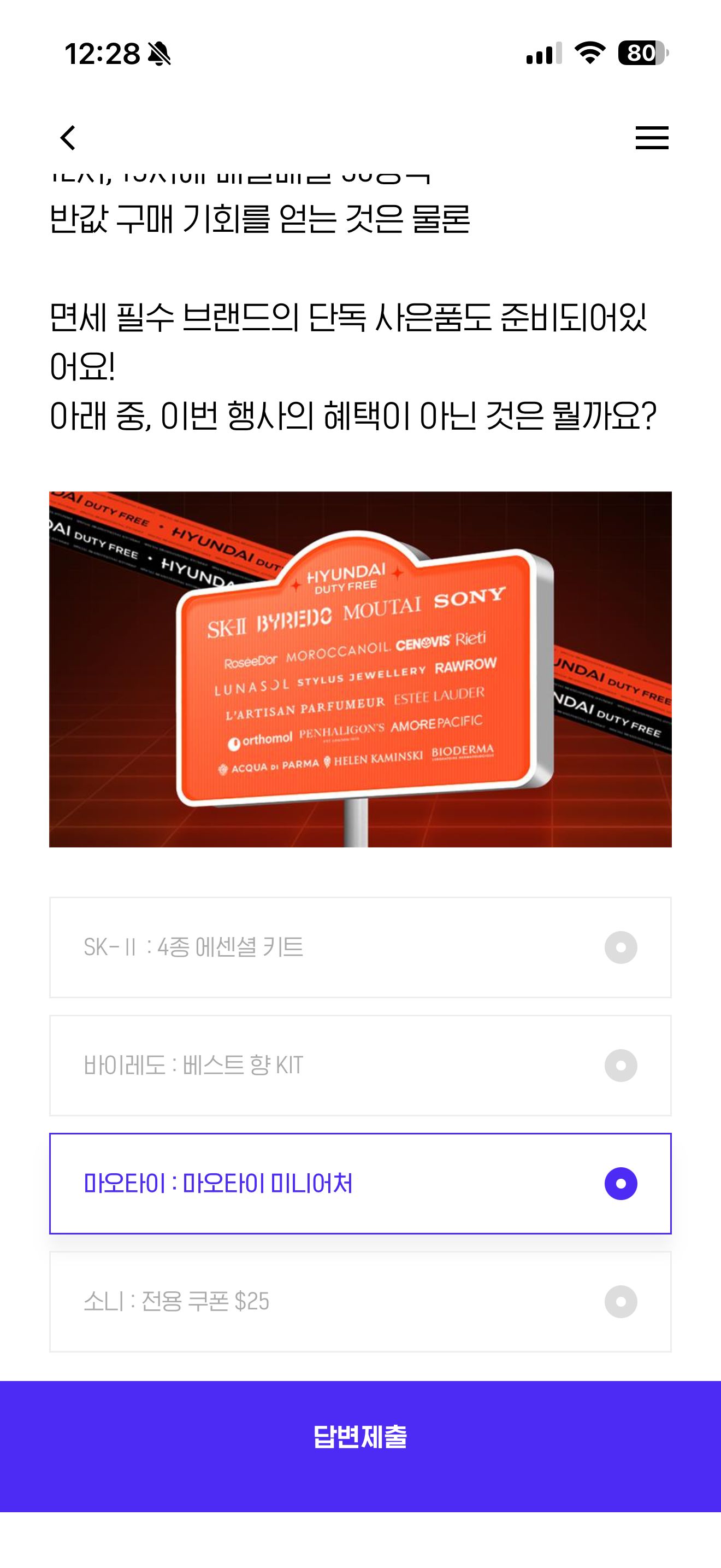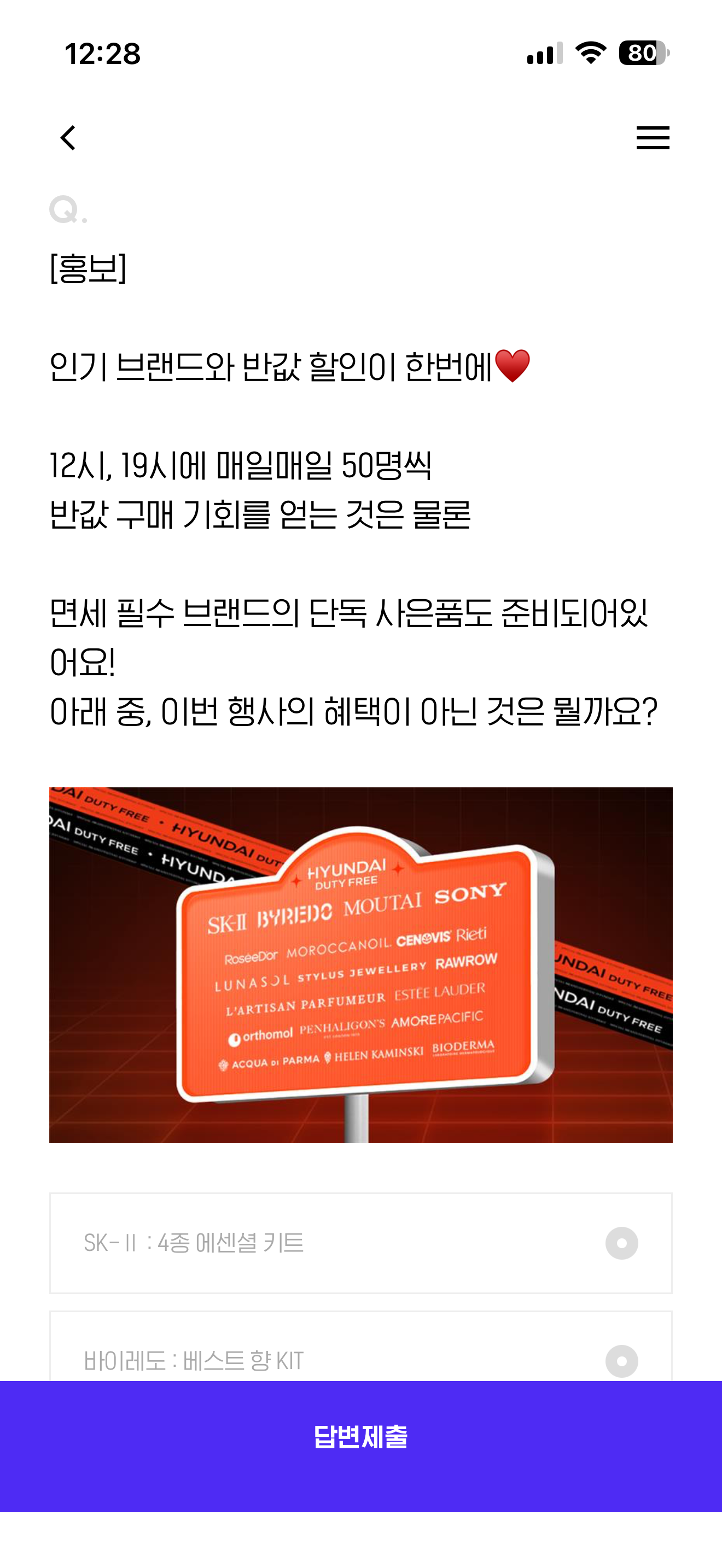 인기 브랜드와 반값 할인이 한번에 12시, 19시에 매일매일 50명씩 반값 구매 기회를 얻는 것은 물론 면세 필수 브랜드의 단독 사은품도 준비되어있어요! 아래 중, 이번 행사의 혜택이 아닌 것은 뭘까요? 보기는 1. SK2 : 4종 에센셜 키트 2. 바이레도: 베스트 향 KIT 3. 마오타이 : 마오타이 미니어처 4. 소니:전용쿠폰 $25