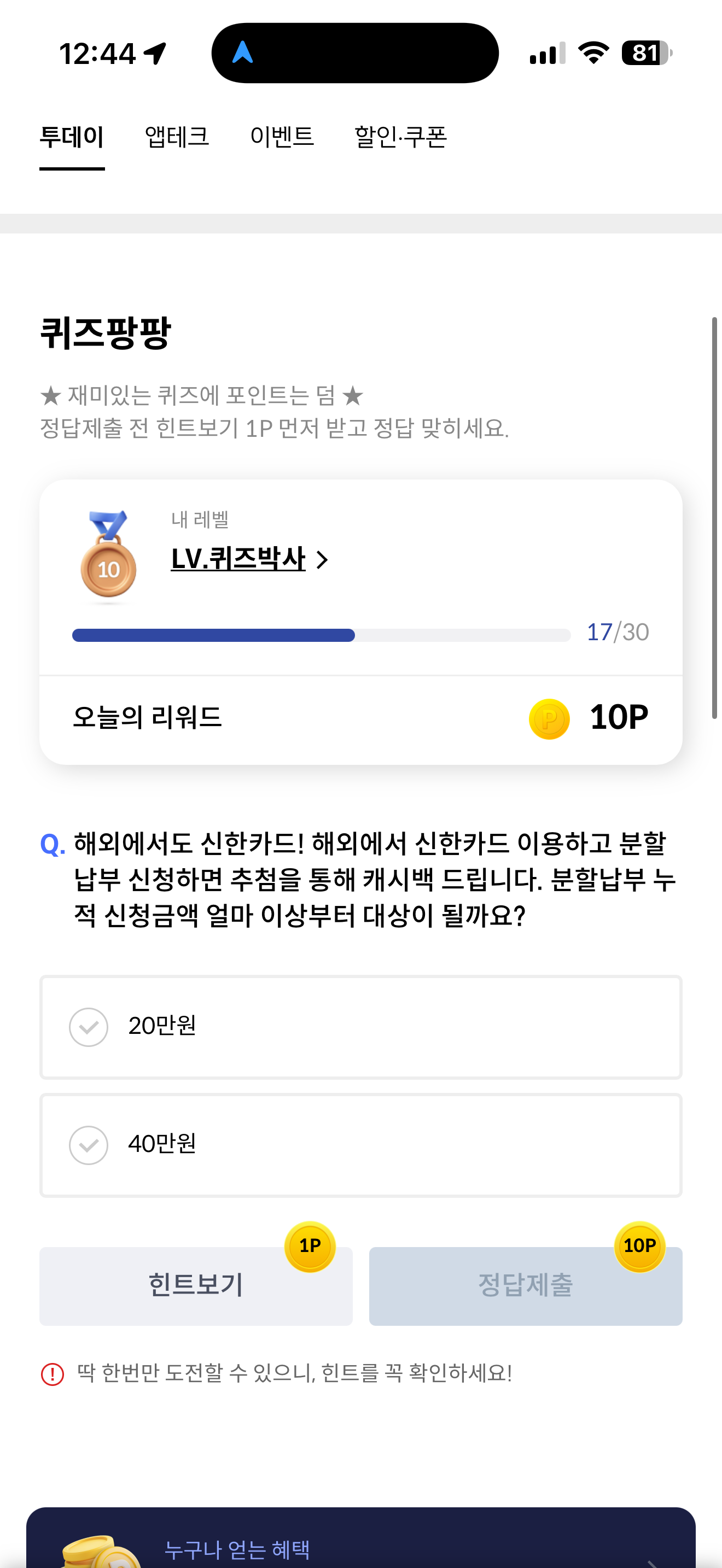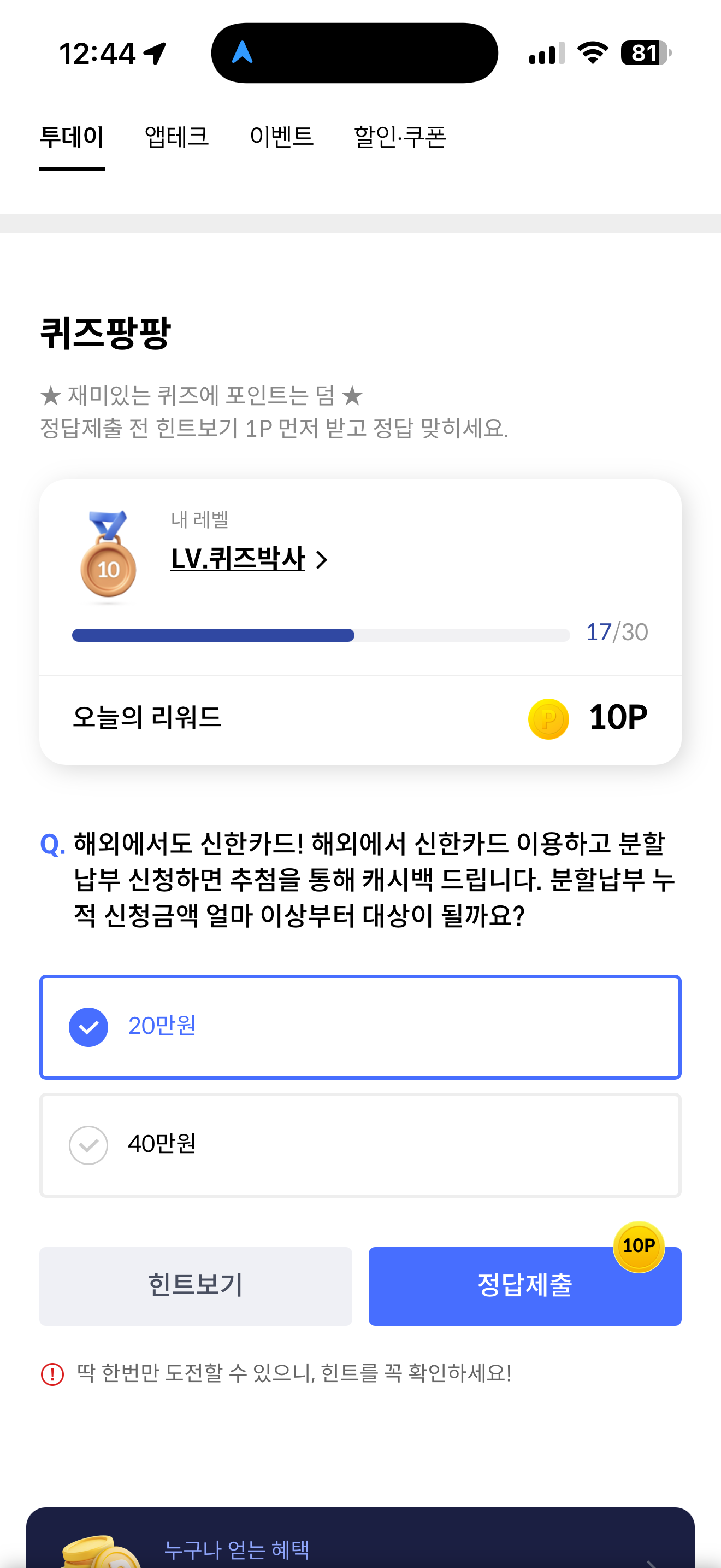 신한카드 퀴즈팡팡 정답은 20만원 입니다