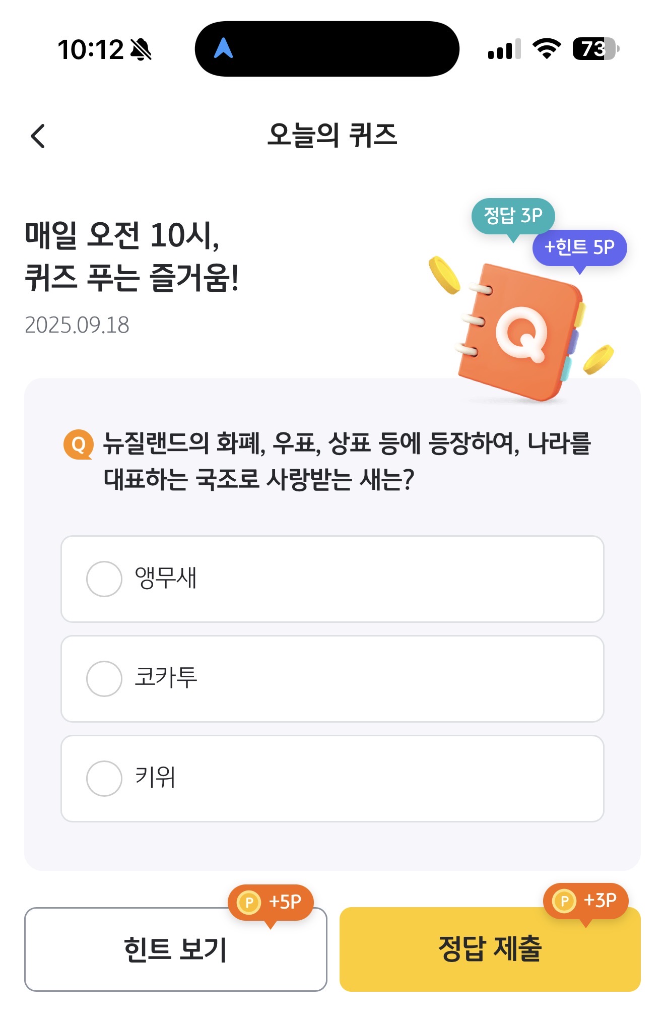 KB Pay 오늘의 퀴즈 9월 18일 정답(뉴질랜드의 화폐, 우표, 상표 등에 등장하여, 나라를 대표하는 국조로 사랑받는 새는?)