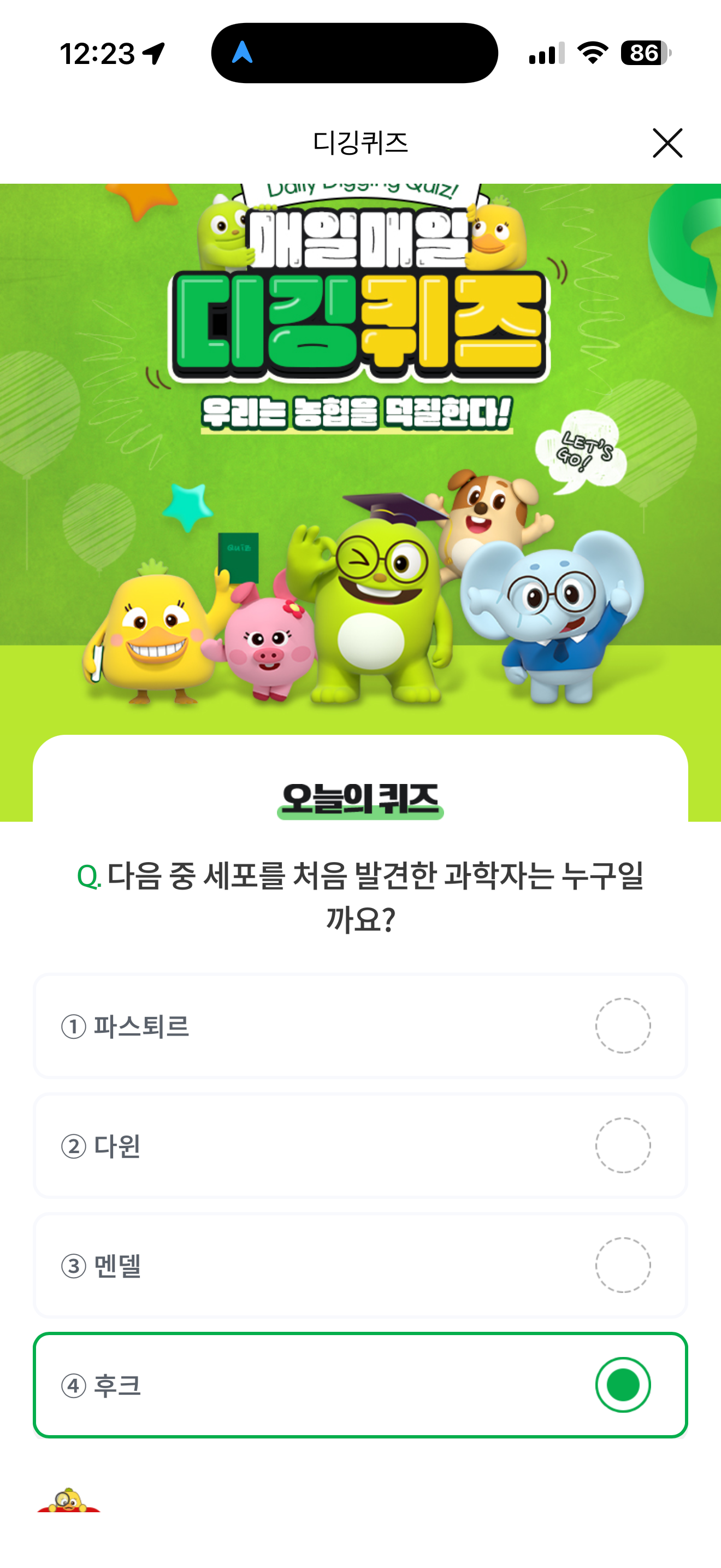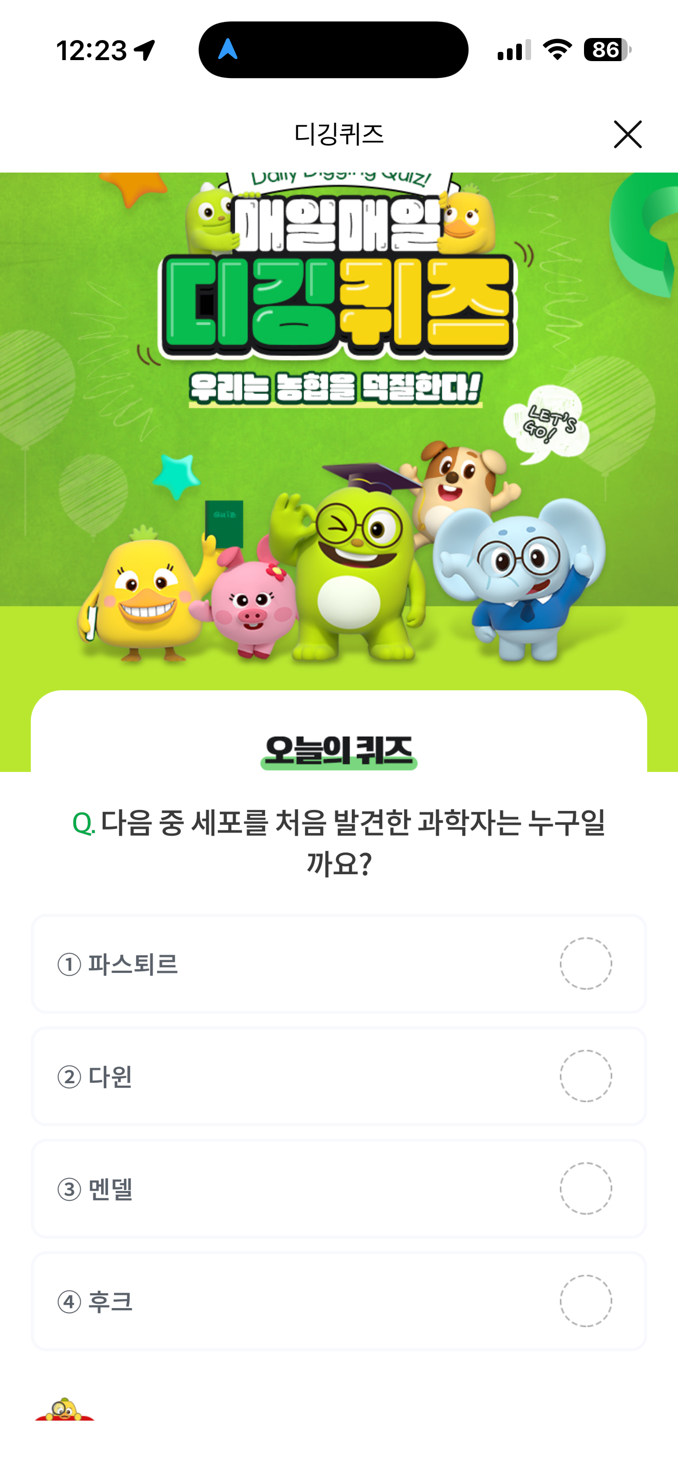 다음 중 세포를 처음 발견한 과학자는 누구일까요? 보기는 1. 파스퇴르 2. 다윈 3. 멘델 4. 후크 입니다. 세포를 초음 발견한 과학자는 잘 모르고 계셨죠? 세포에 대한 것은 현대 과학에서 굉장히 중요한 부분인데요. 상식적으로 알아두세요