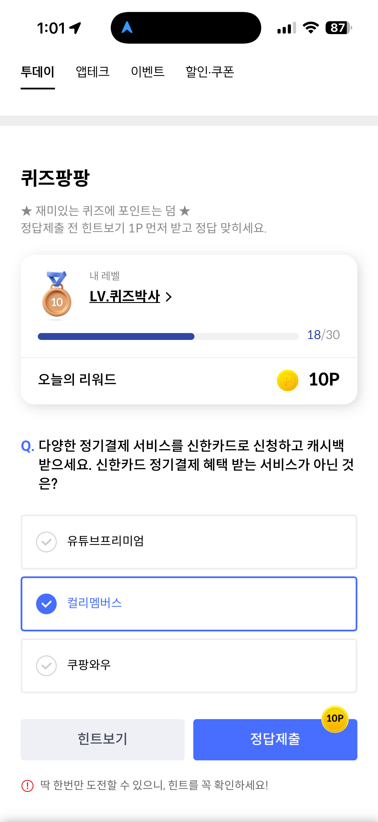 신한카드 퀴즈팡팡 9월 19일 문제입니다