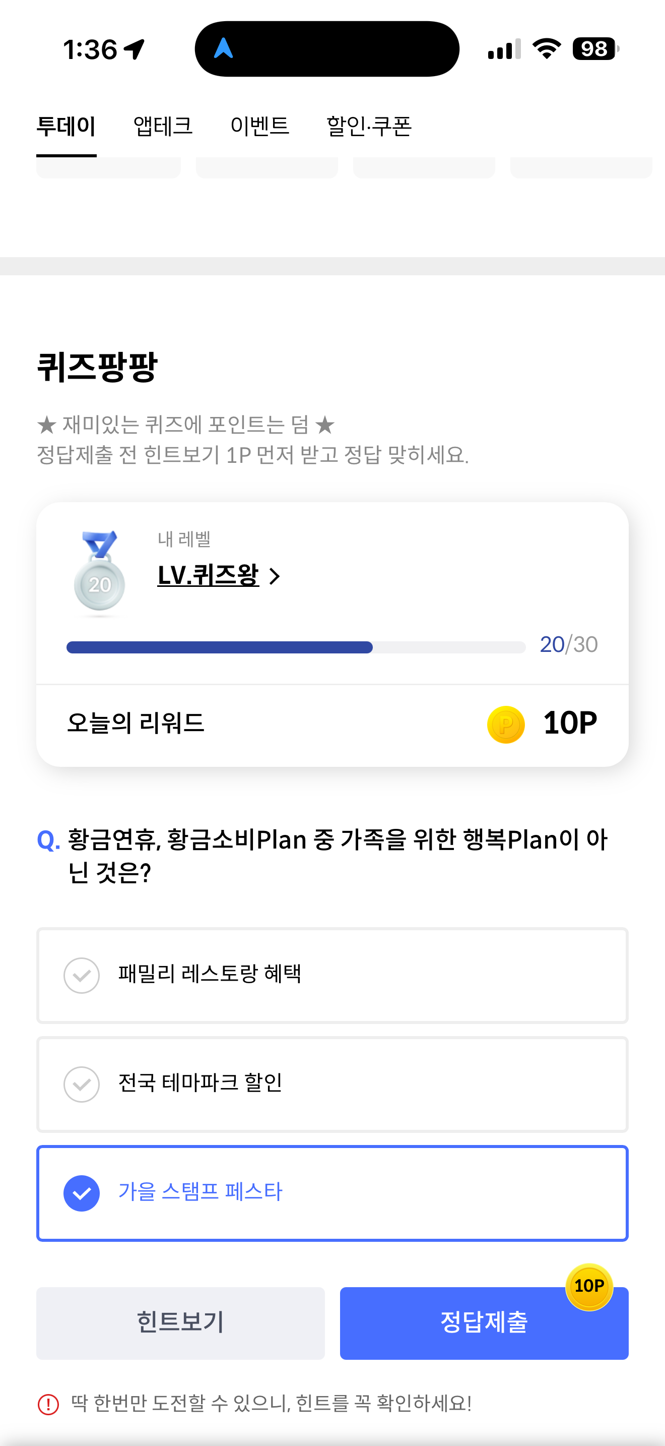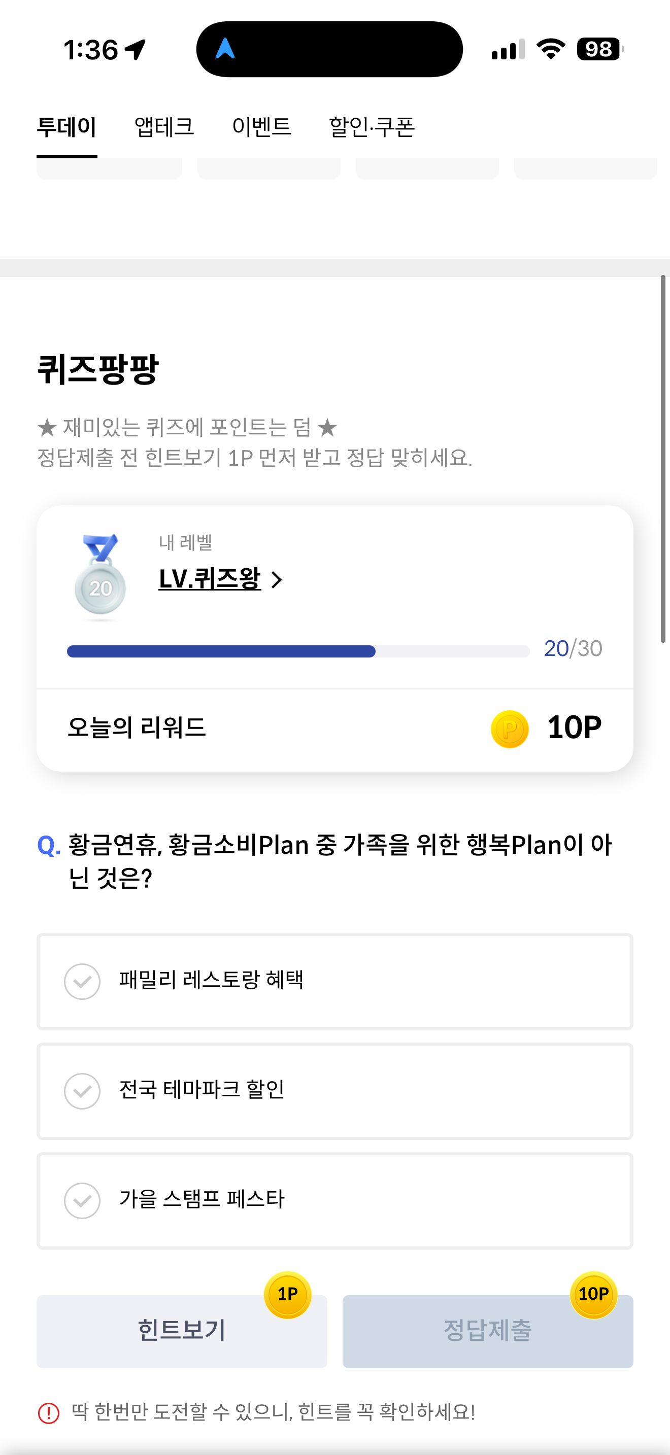 신한카드 퀴즈팡팡 9월 22일 문제입니다