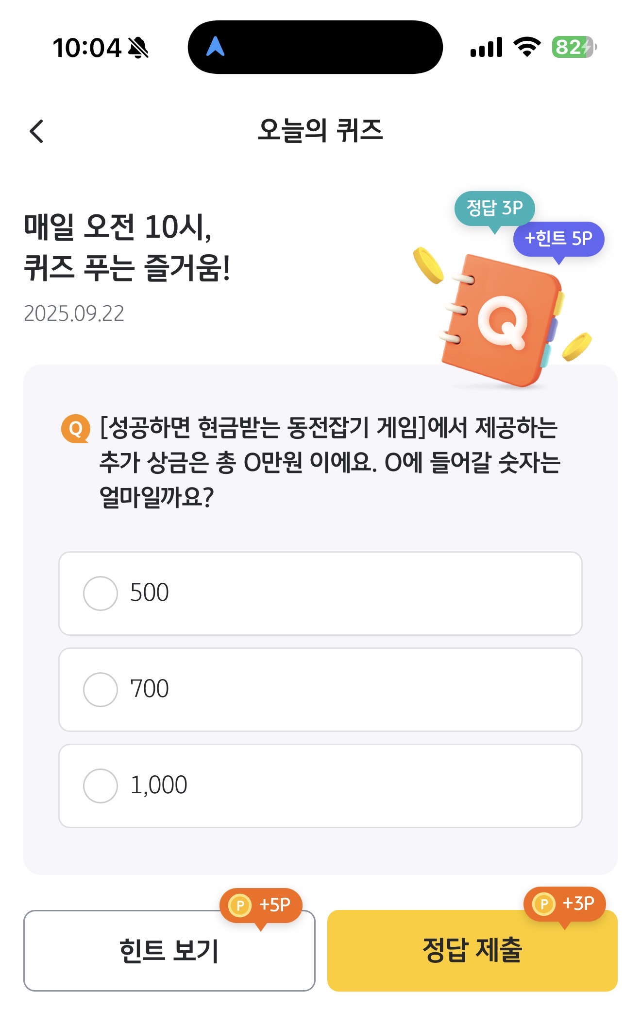 KB Pay 오늘의 퀴즈 9월 22일 정답([성공하면 현금받는 동전잡기 게임]에서 제공하는 추가 상금은 총 O만원 이에요. O에 들어갈 숫자는 얼마일까요?)