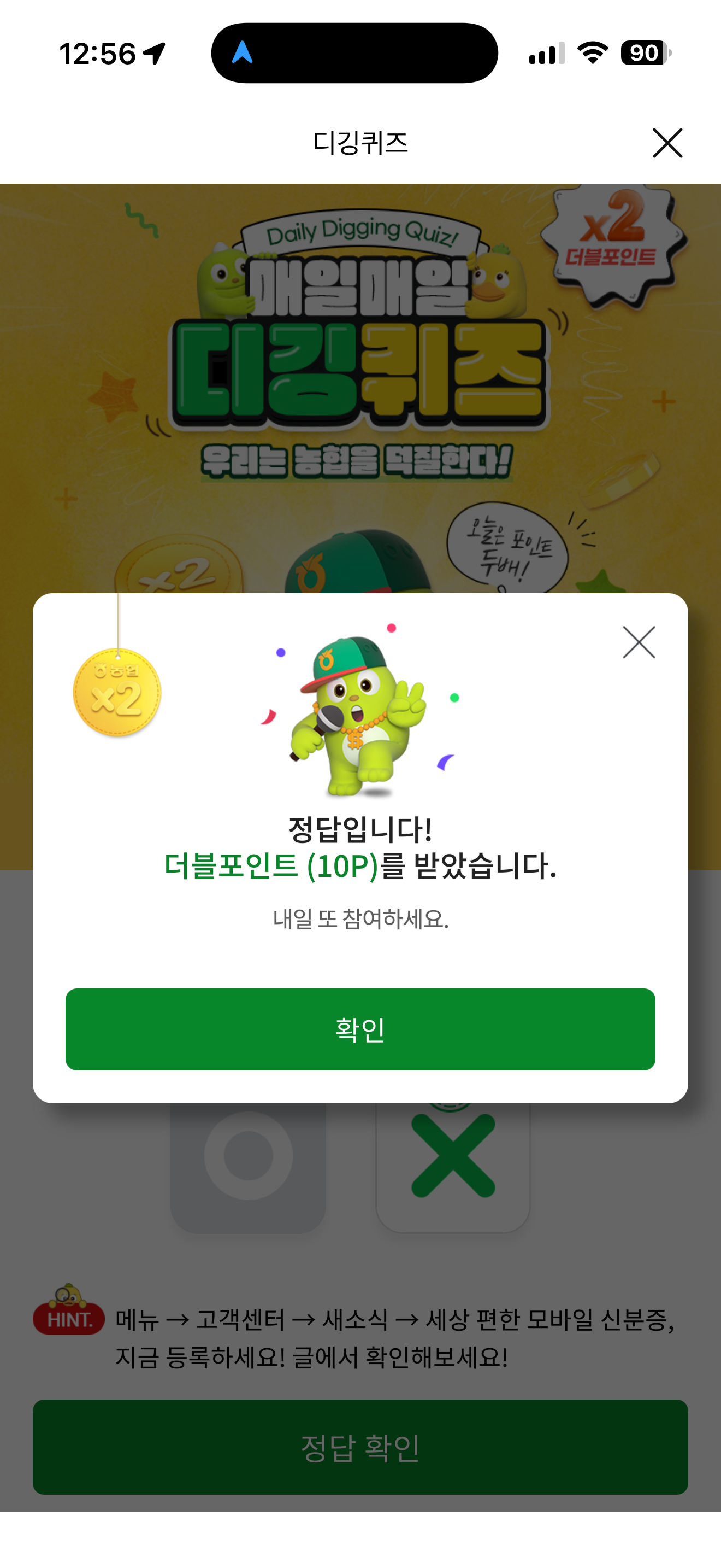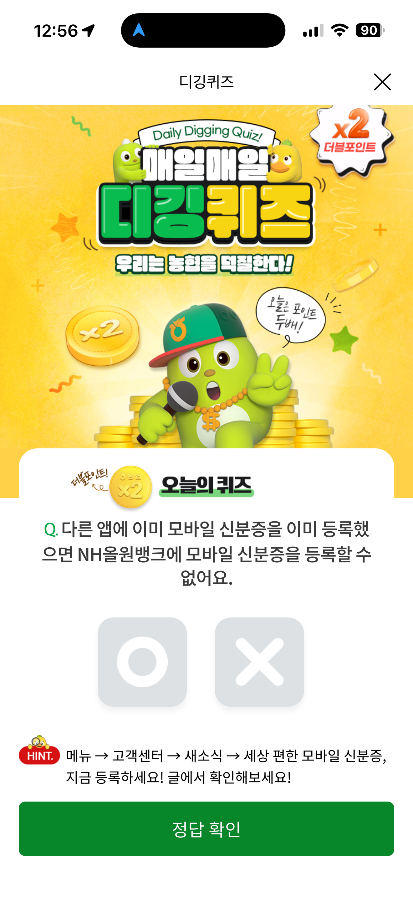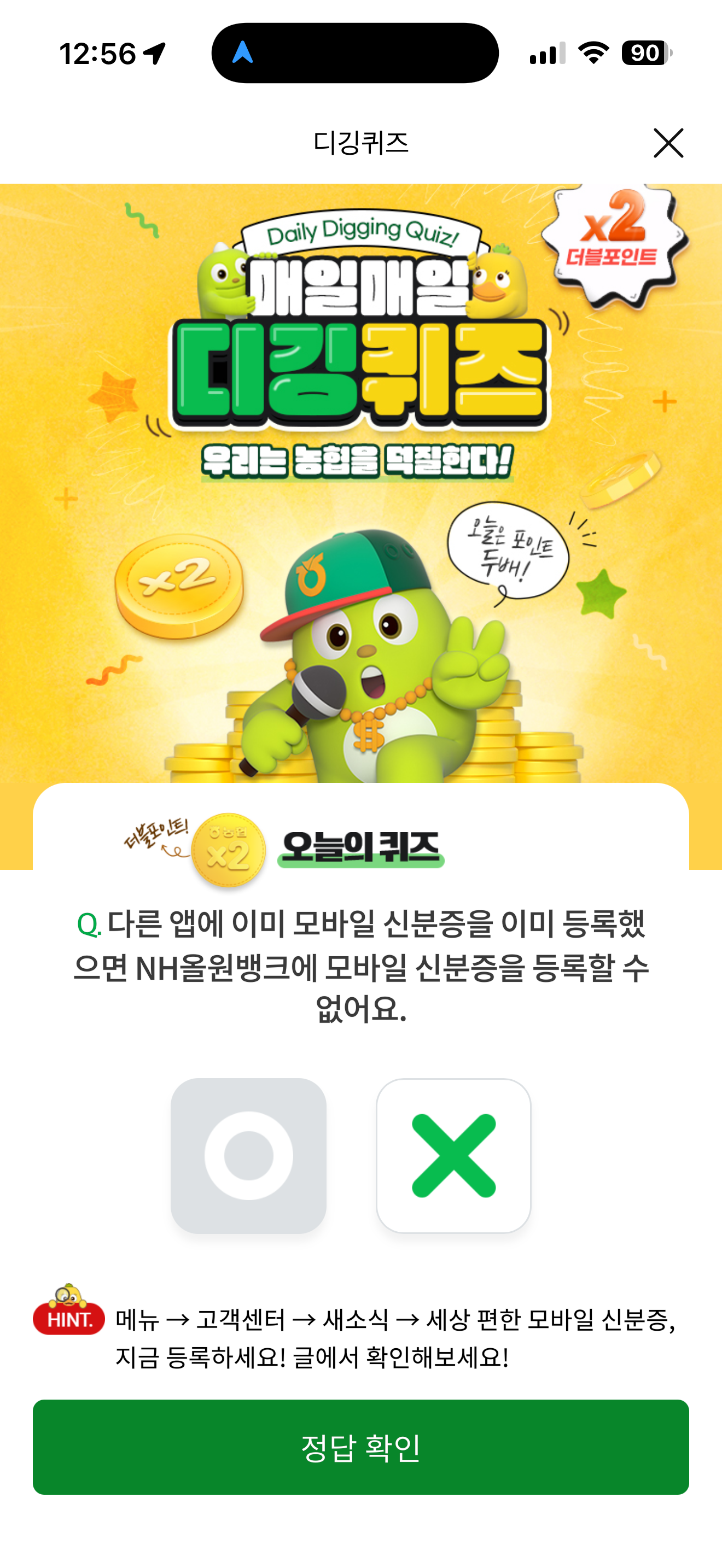 NH올원뱅크 디깅퀴즈 정답은 X 입니다