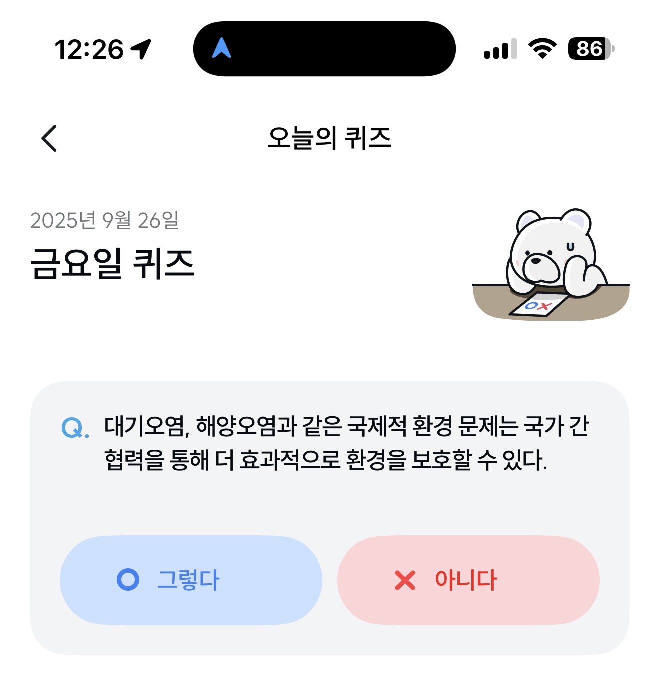 기후행동 기회소득 오늘의 퀴즈 9월 26일 정답(대기오염, 해양오염과 같은 국제적 환경 문제는 국가 간 협력을 통해 더 효과적으로 환경을 보호할 수 있다)