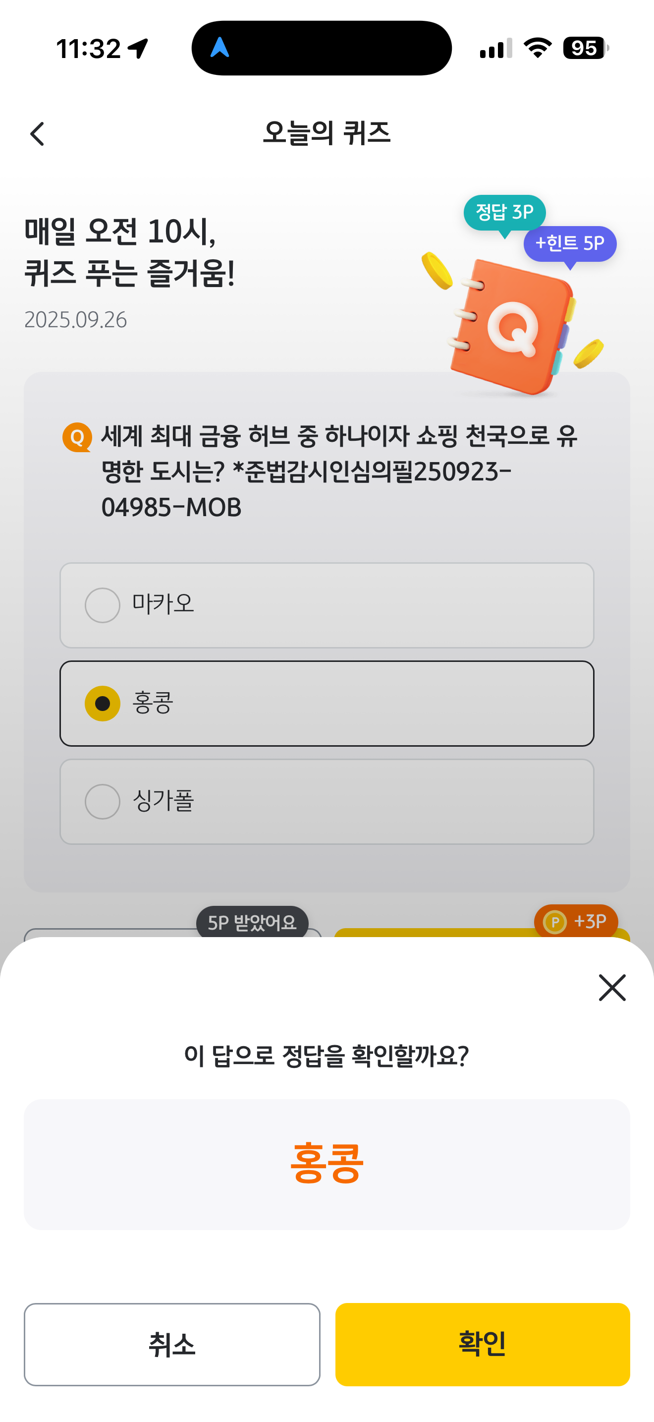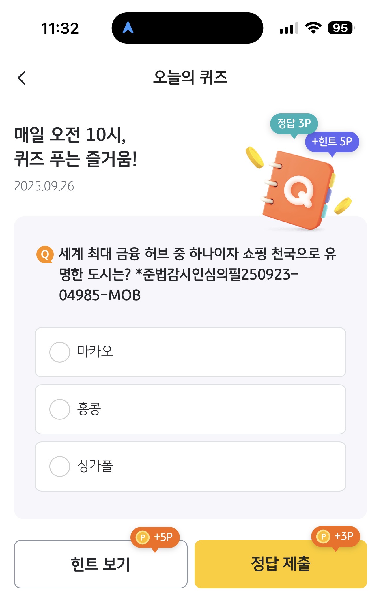 세계 최대 금융 허브 중 하나이자 쇼핑 천국으로 유명한 도시는? *준법감시인심의필250923-04985-MOB 보기는 1. 마카오 2. 홍콩 3. 싱가폴 입니다 세계 최대 금융 허브이고 쇼핑 천국이라고 합니다. 여행으로 많이 가는 곳인데요. 참고해 두세요