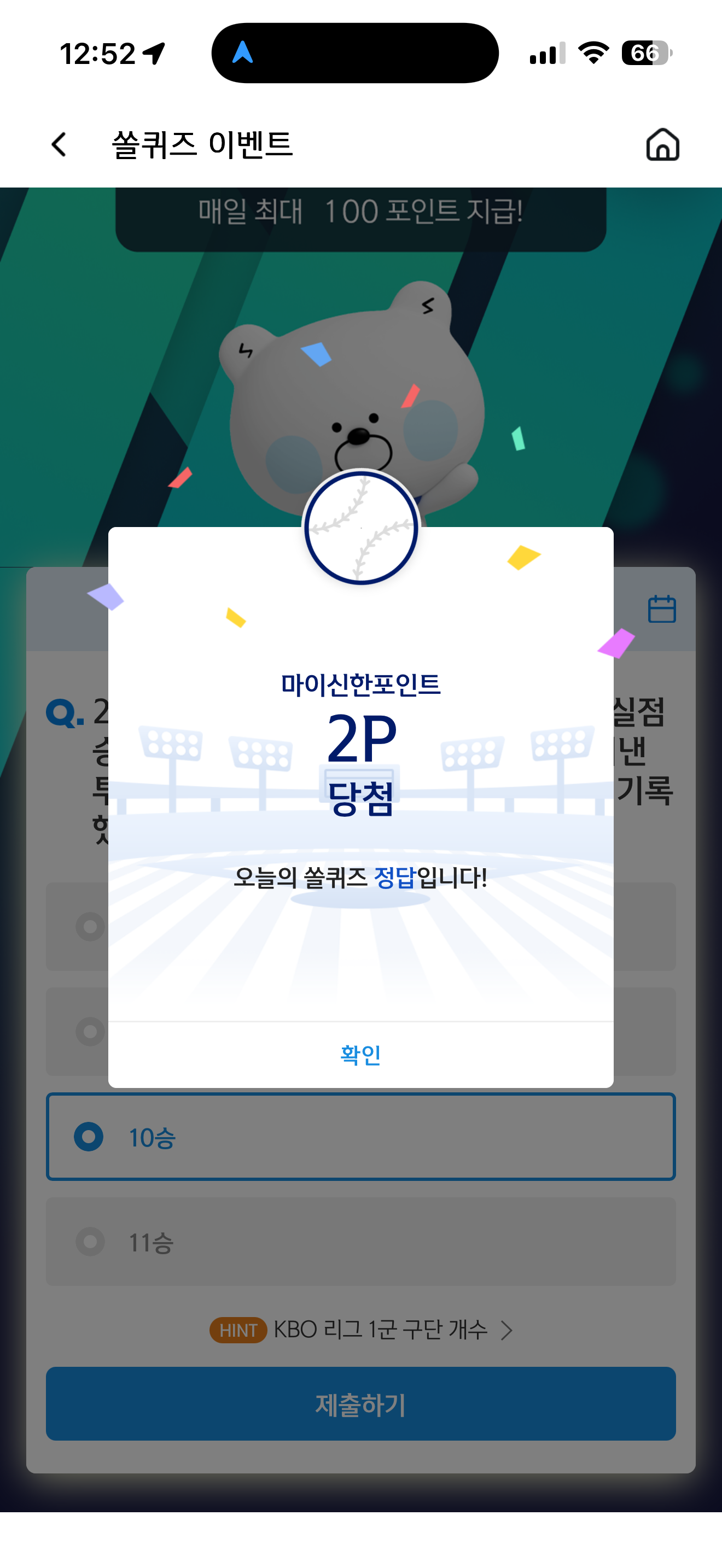 신한 슈퍼SOL 야구/상식 쏠퀴즈 정답은 10승 입니다
