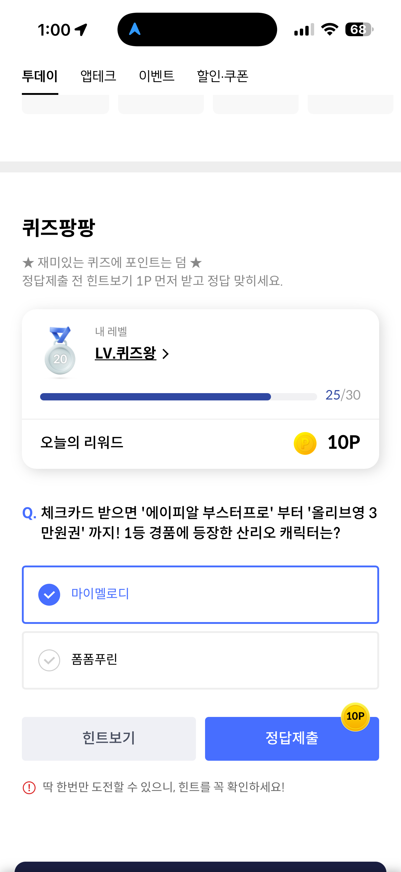 체크카드 받으면 '에이피알 부스터프로' 부터 '올리브영 3만원권' 까지! 1등 경품에 등장한 산리오 캐릭터는? 보기는 1. 마이멜로디 2. 폼폼푸린 입니다.