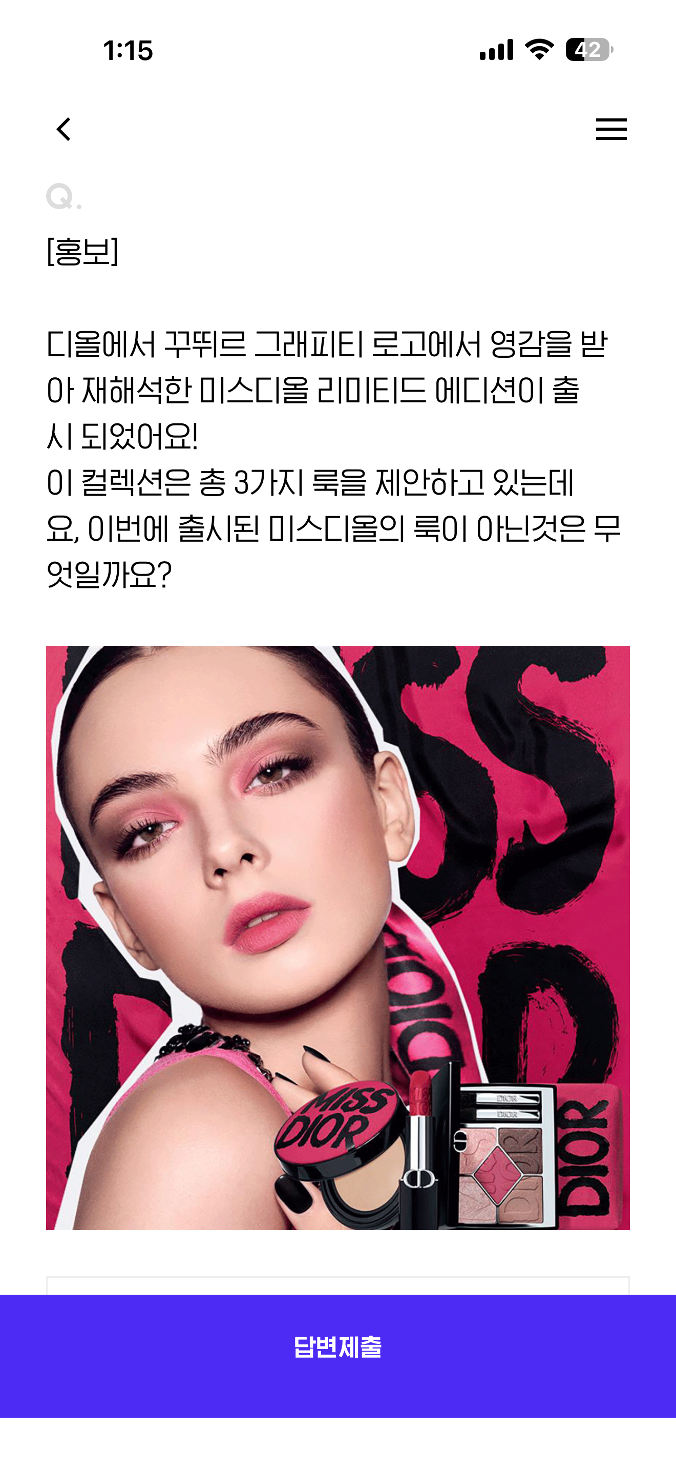 H포인트 퀴즈 9월 28일 정답(디올에서 꾸뛰르 그래피티 로고에서 영감을 받아 재해석한 미스디올 리미티드 에디션이 출시 되었어요! 이 컬렉션은 총 3가지 룩을 제안하고 있는데요, 이번에 출시된 미스디올의 룩이 아닌것은 무엇일까요?)