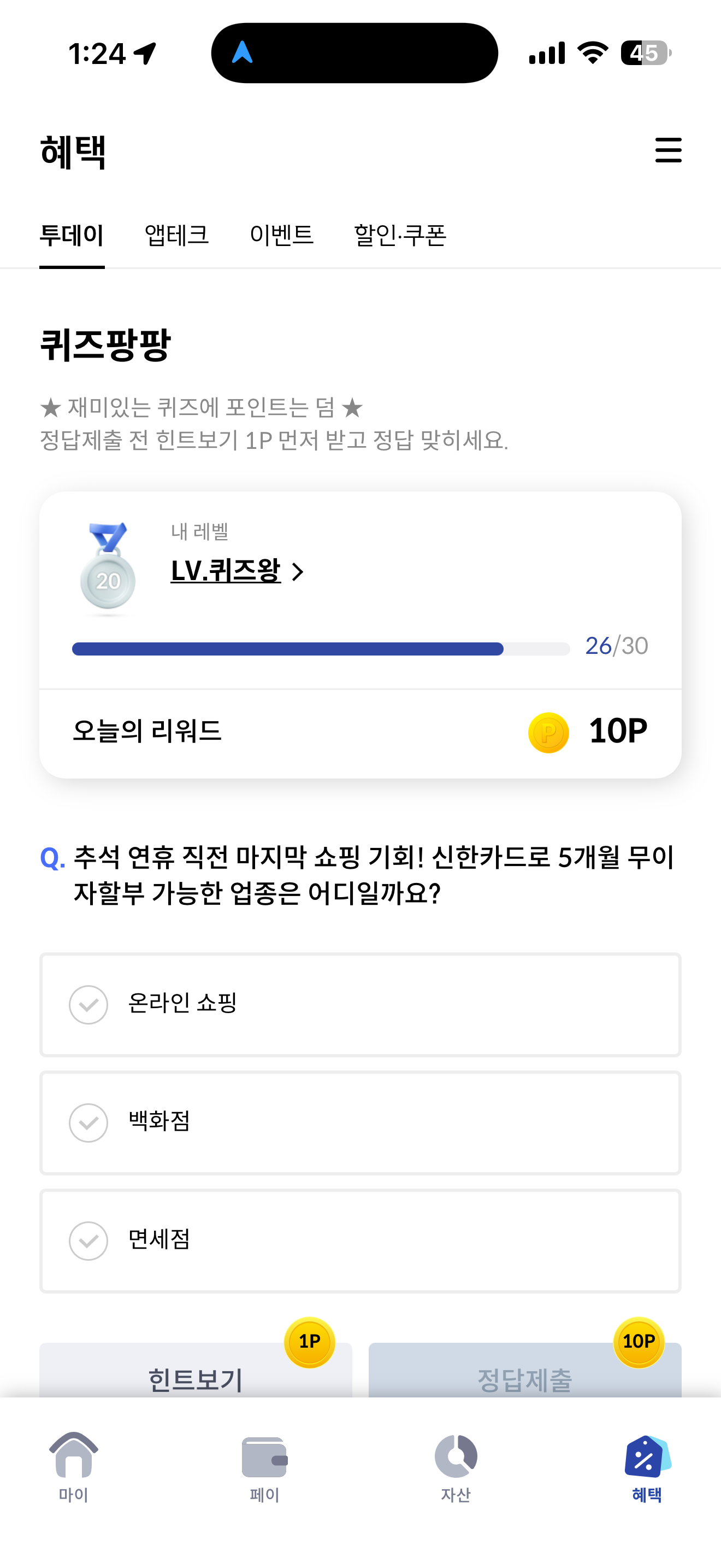 신한카드 퀴즈팡팡 정답은 온라인 쇼핑 입니다