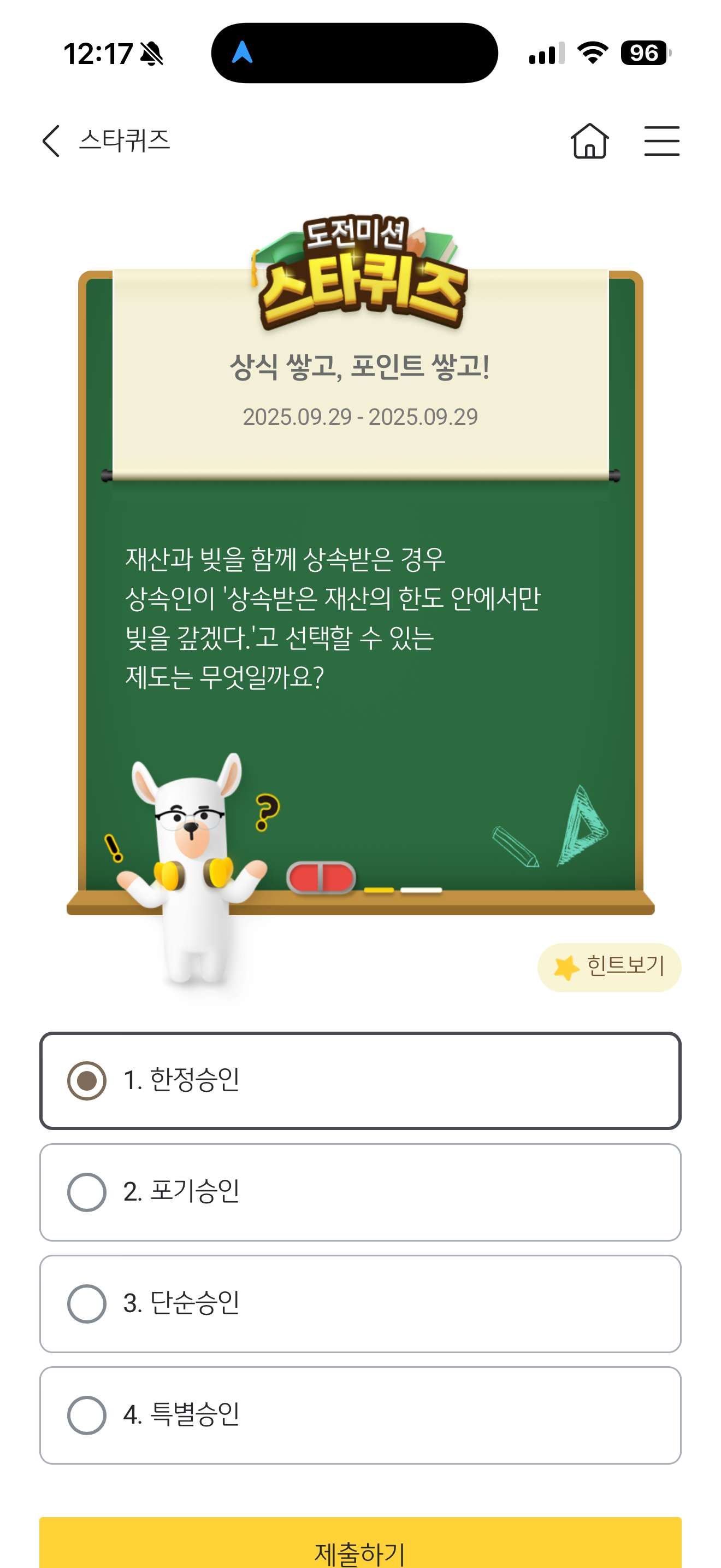 KB스타뱅킹 스타퀴즈 정답은 1. 한정승인 입니다