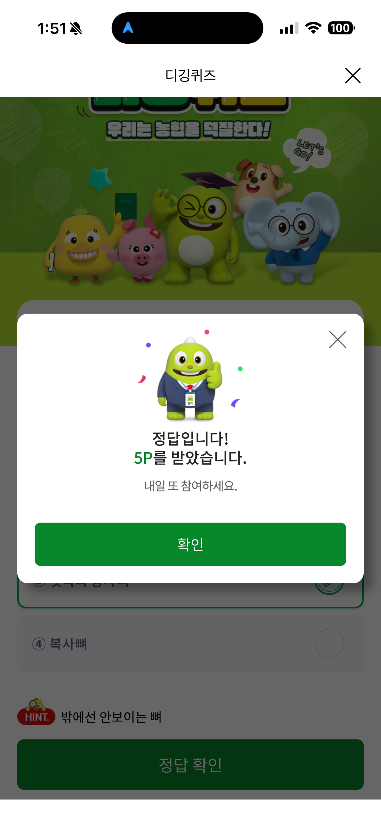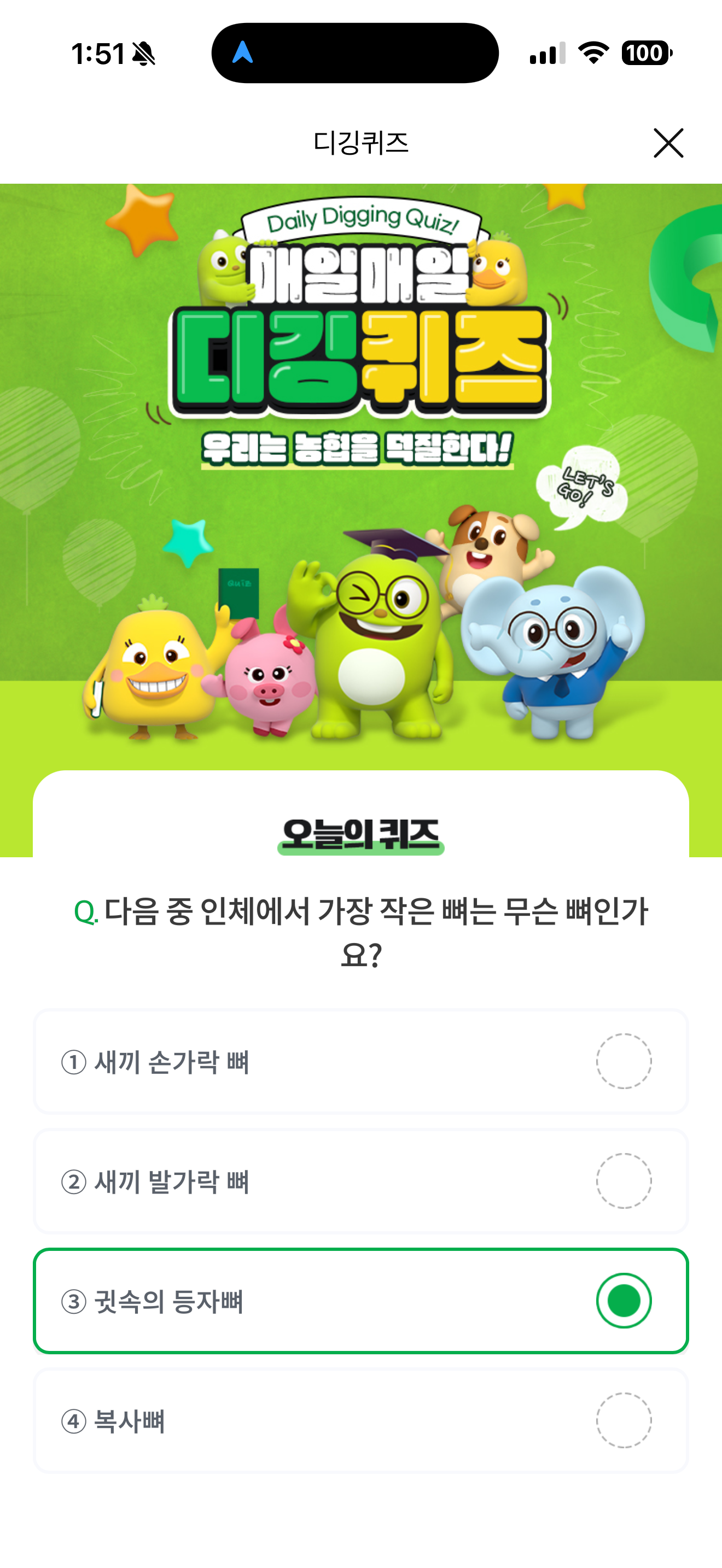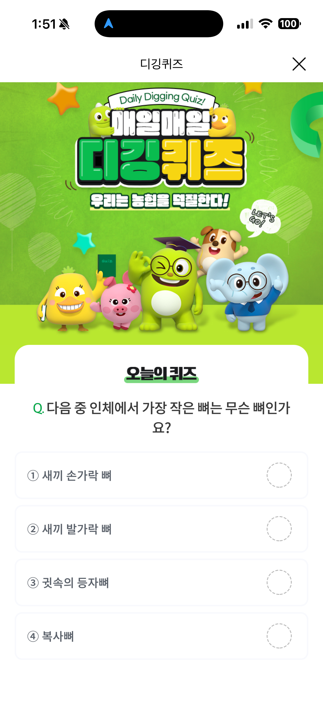 NH올원뱅크 디깅퀴즈 정답은 귓속의 등자뼈 입니다
