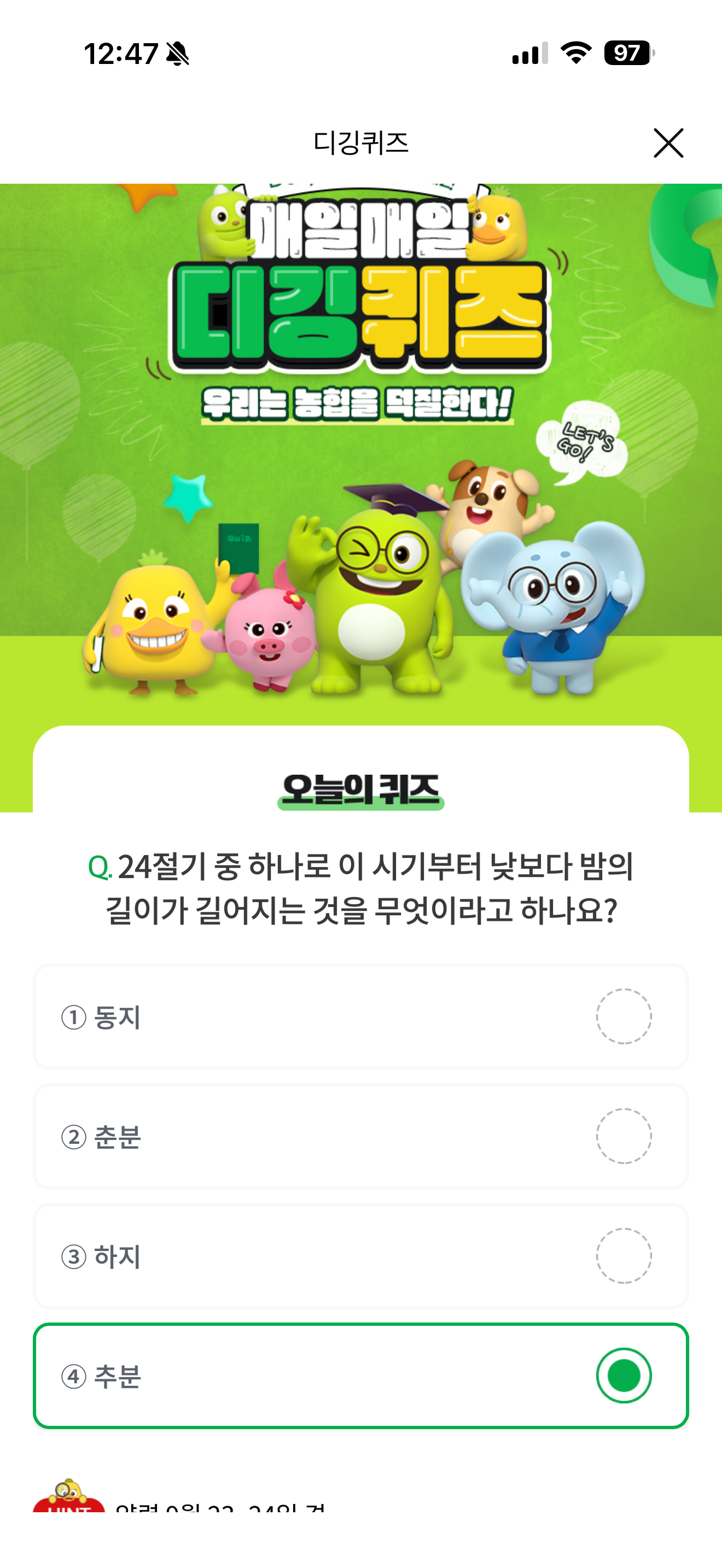 NH올원뱅크 디깅퀴즈 정답은 추분 입니다