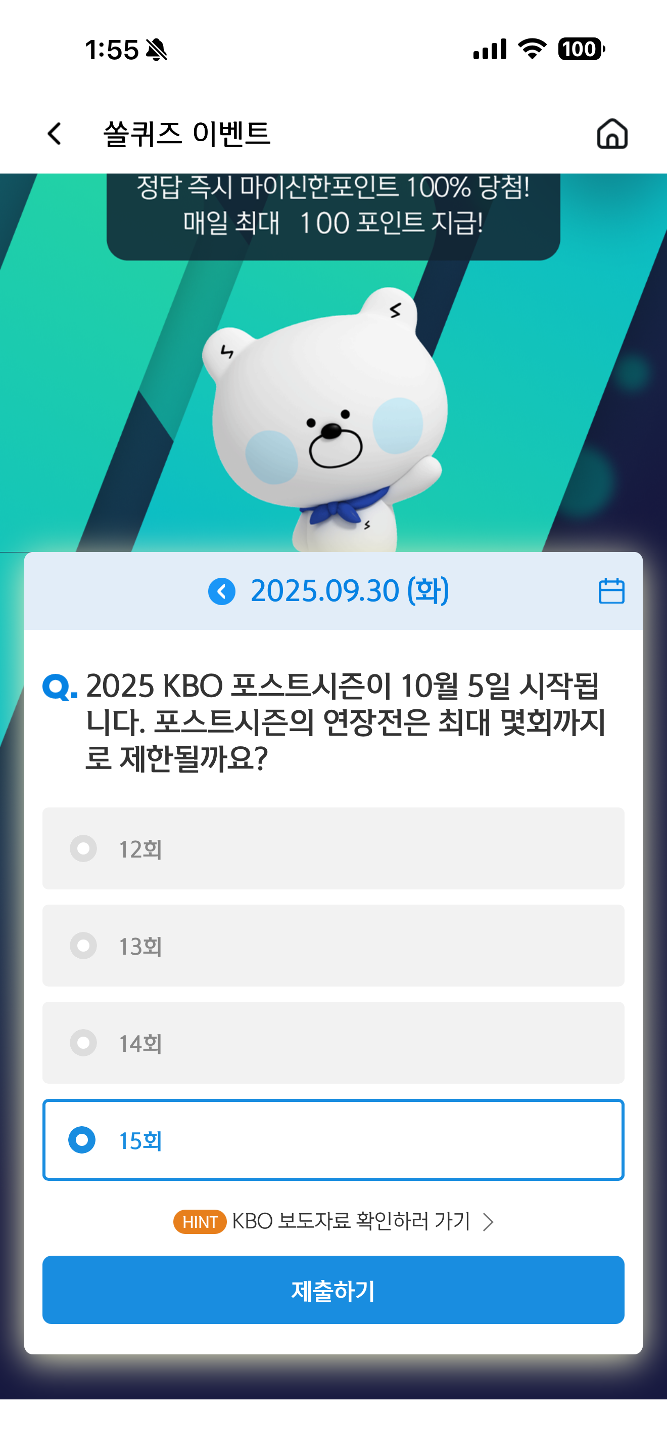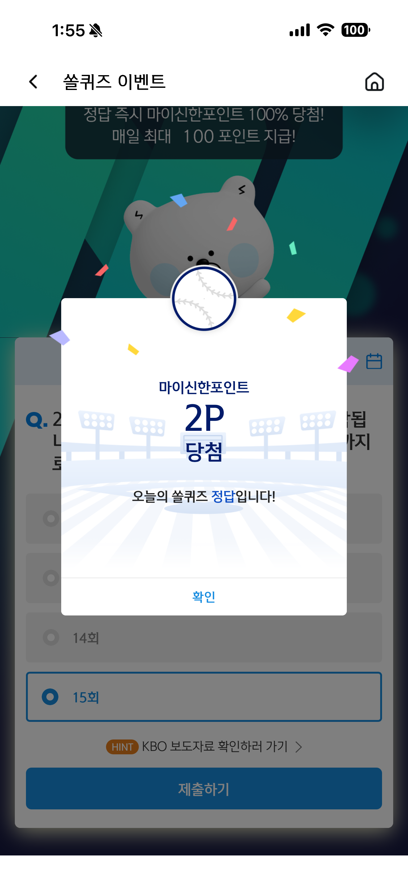 신한 슈퍼SOL 야구/상식 쏠퀴즈 정답은 15회 입니다