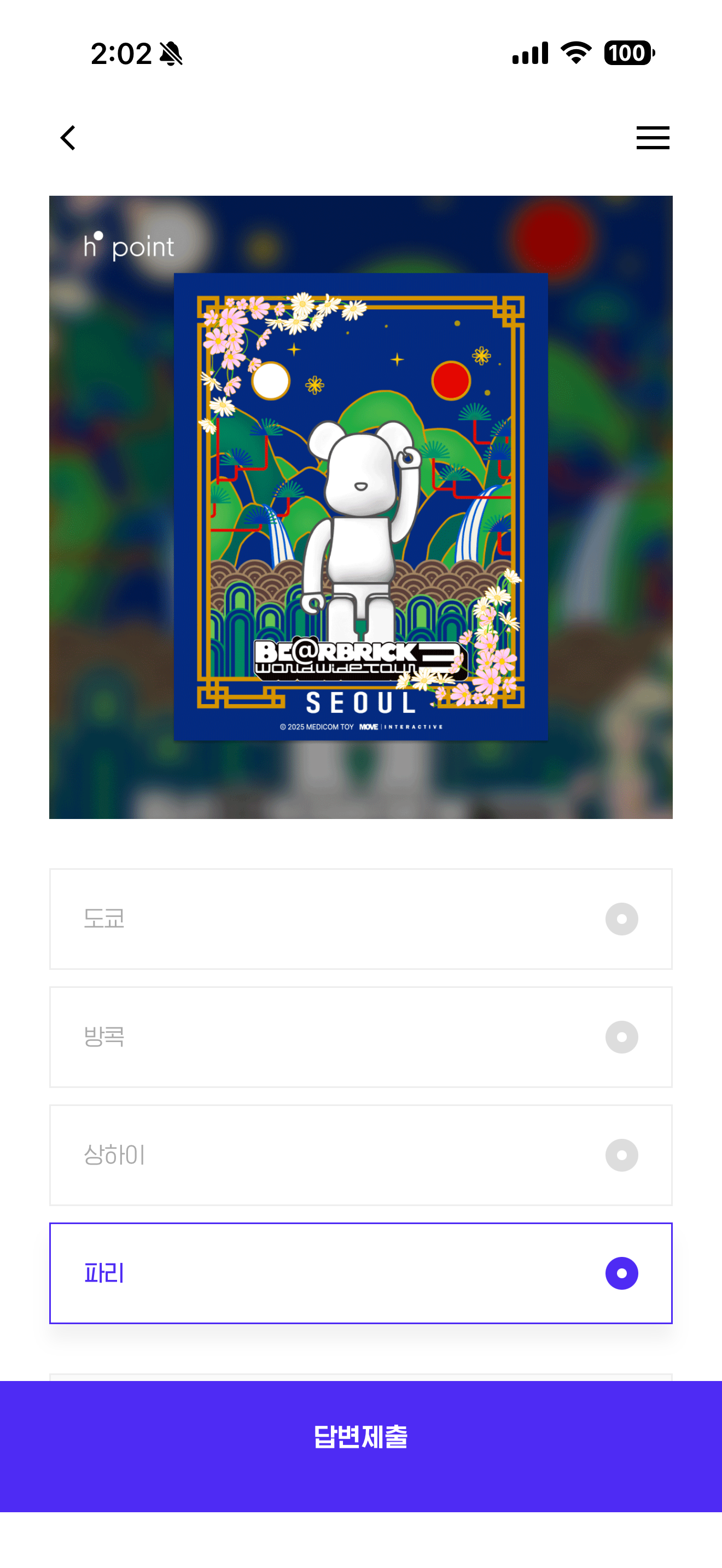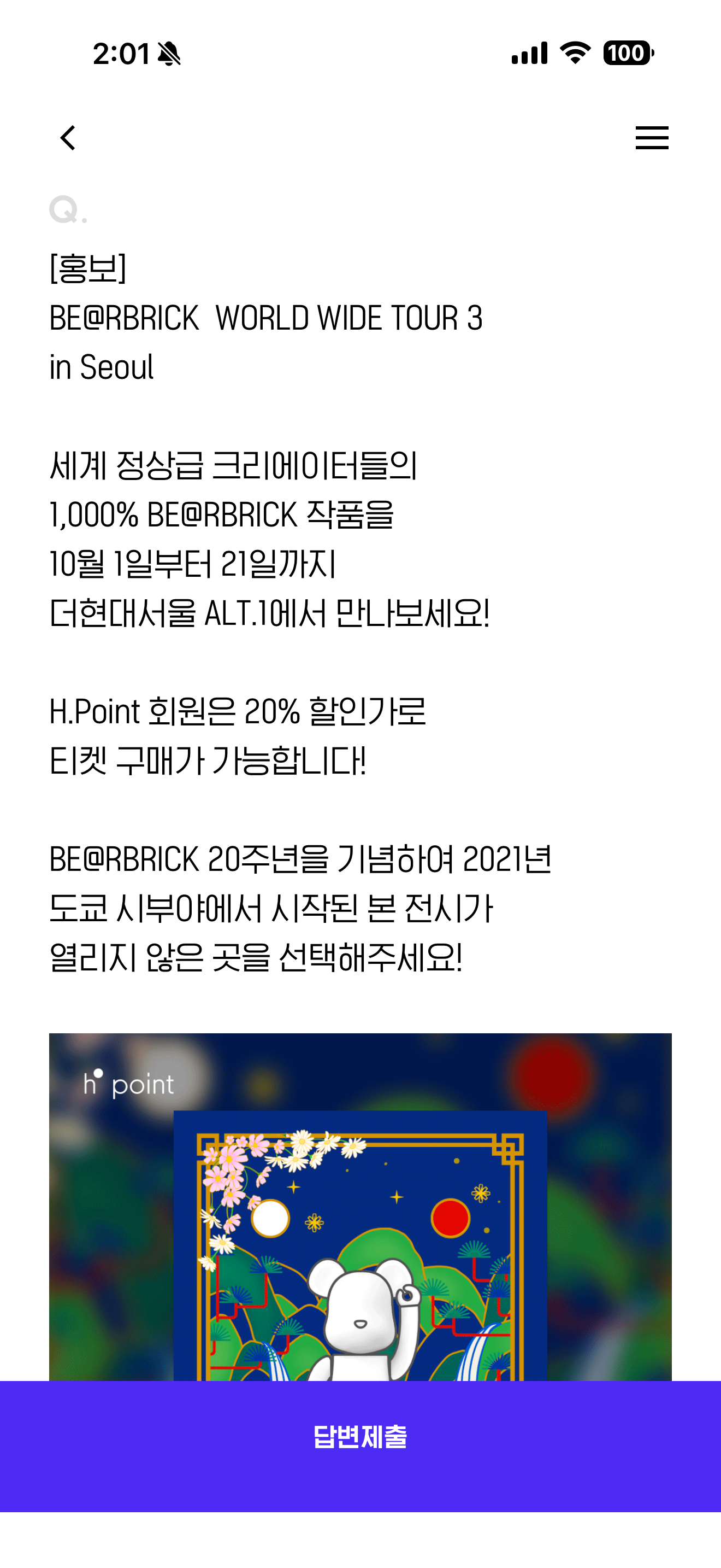 BE@RBRICK WORLD WIDE TOUR 3 in Seoul 세계 정상급 크리에이터들의 1,000% BE@RBRICK 작품을 10월 1일부터 21일까지 더현대서울 ALT.1에서 만나보세요! H.Point 회원은 20% 할인가로 티켓 구매가 가능합니다! BE@RBRICK 20주년을 기념하여 2021년 도쿄 시부야에서 시작된 본 전시가 열리지 않은 곳을 선택해주세요!