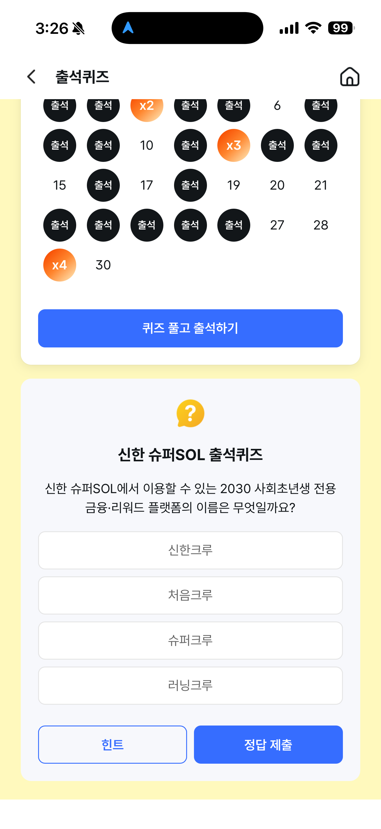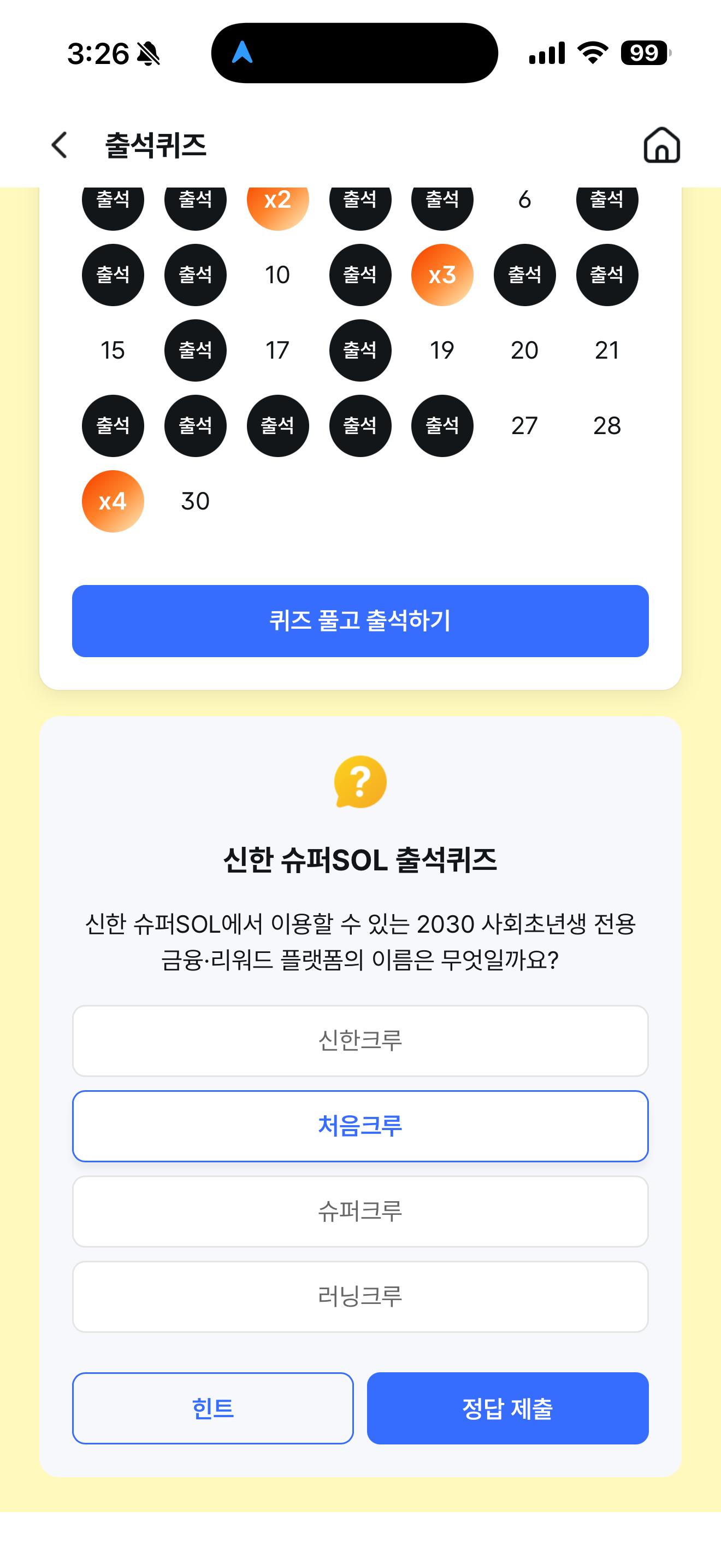 신한 슈퍼SOL 출석퀴즈 정답은 처음크루 입니다