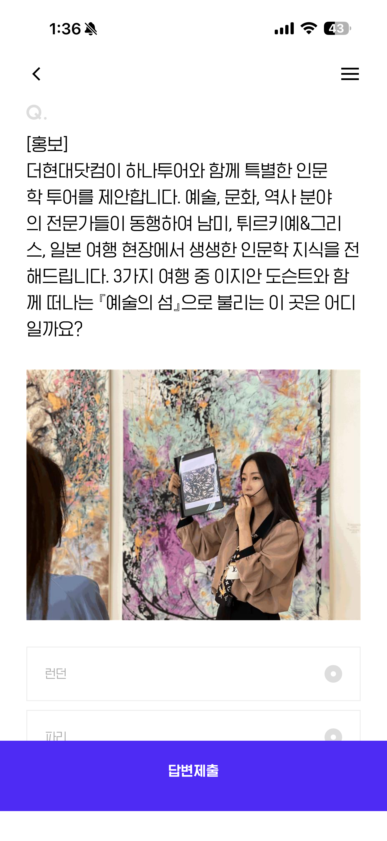 더현대닷컴이 하나투어와 함께 특별한 인문학 투어를 제안합니다. 예술, 문화, 역사 분야의 전문가들이 동행하여 남미, 튀르키예&그리스, 일본 여행 현장에서 생생한 인문학 지식을 전해드립니다. 3가지 여행 중 이지안 도슨트와 함께 떠나는 예술의 섬으로 불리는 이 곳은 어디일까요?