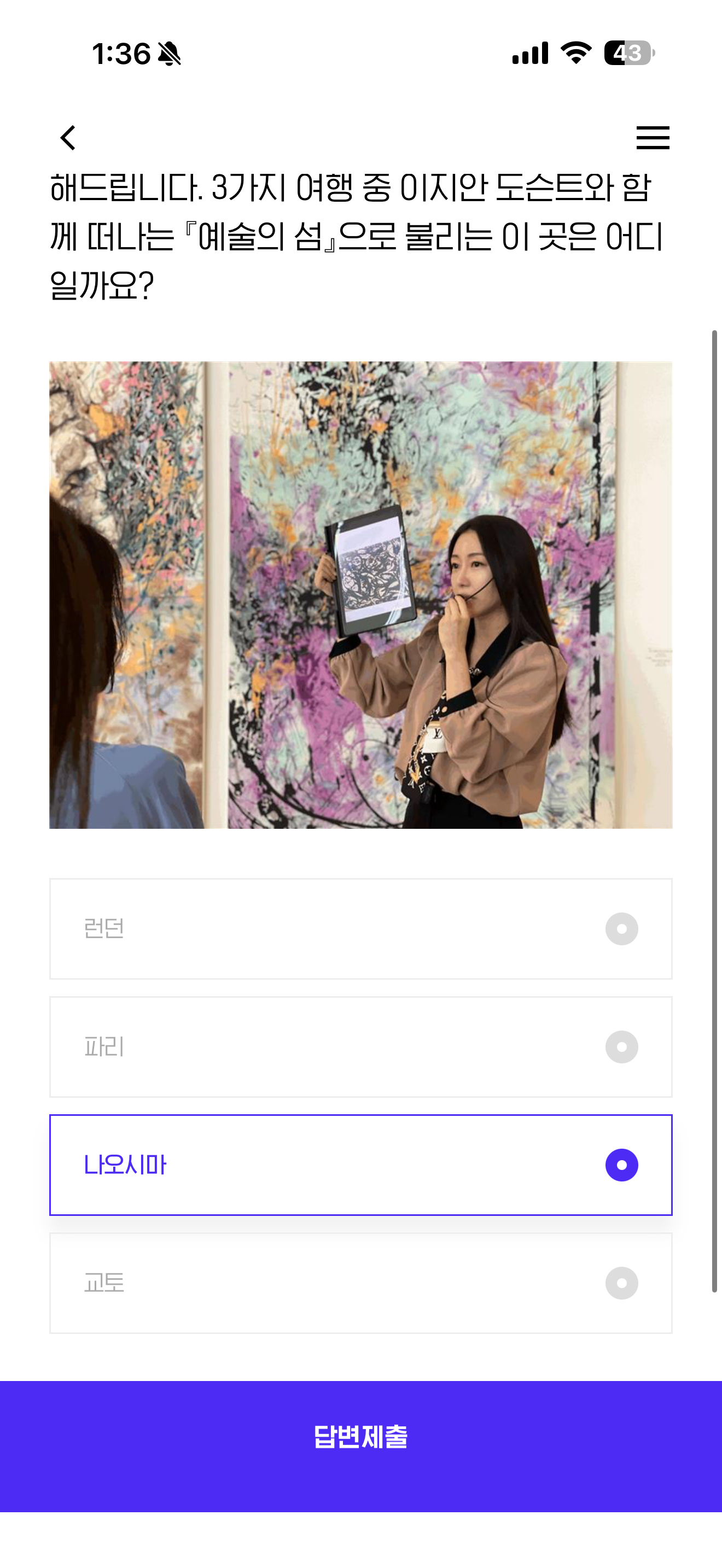 H포인트 퀴즈 정답은 나오시마 입니다