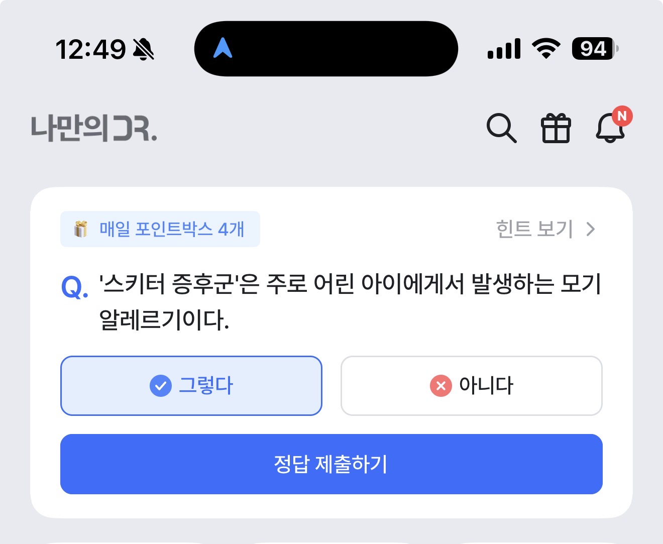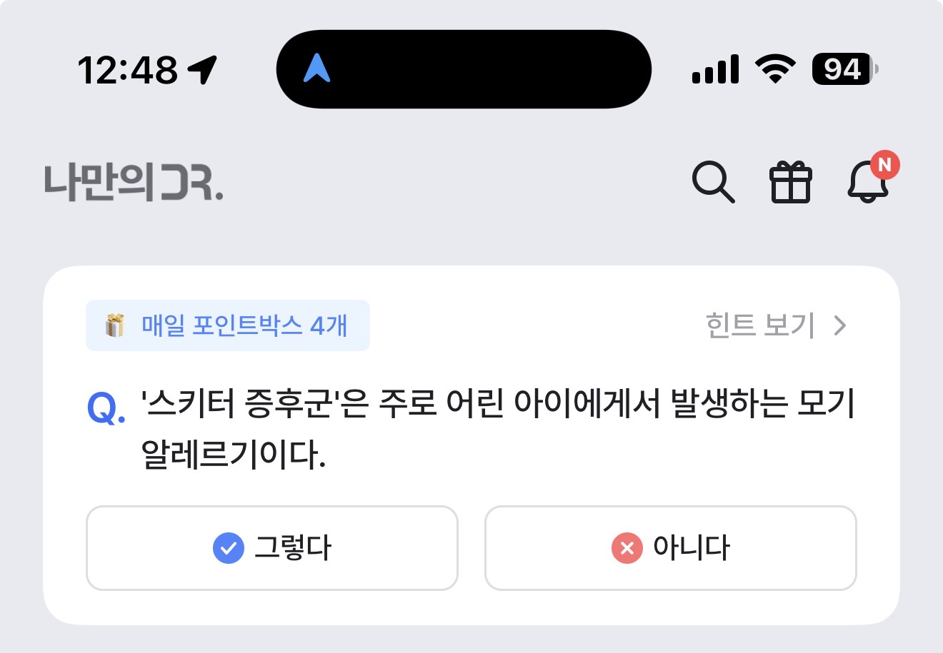 나만의 닥터 퀴즈 10월 2일 정답('스키터 증후군'은 주로 어린 아이에게서 발생하는 모기 알레르기이다)