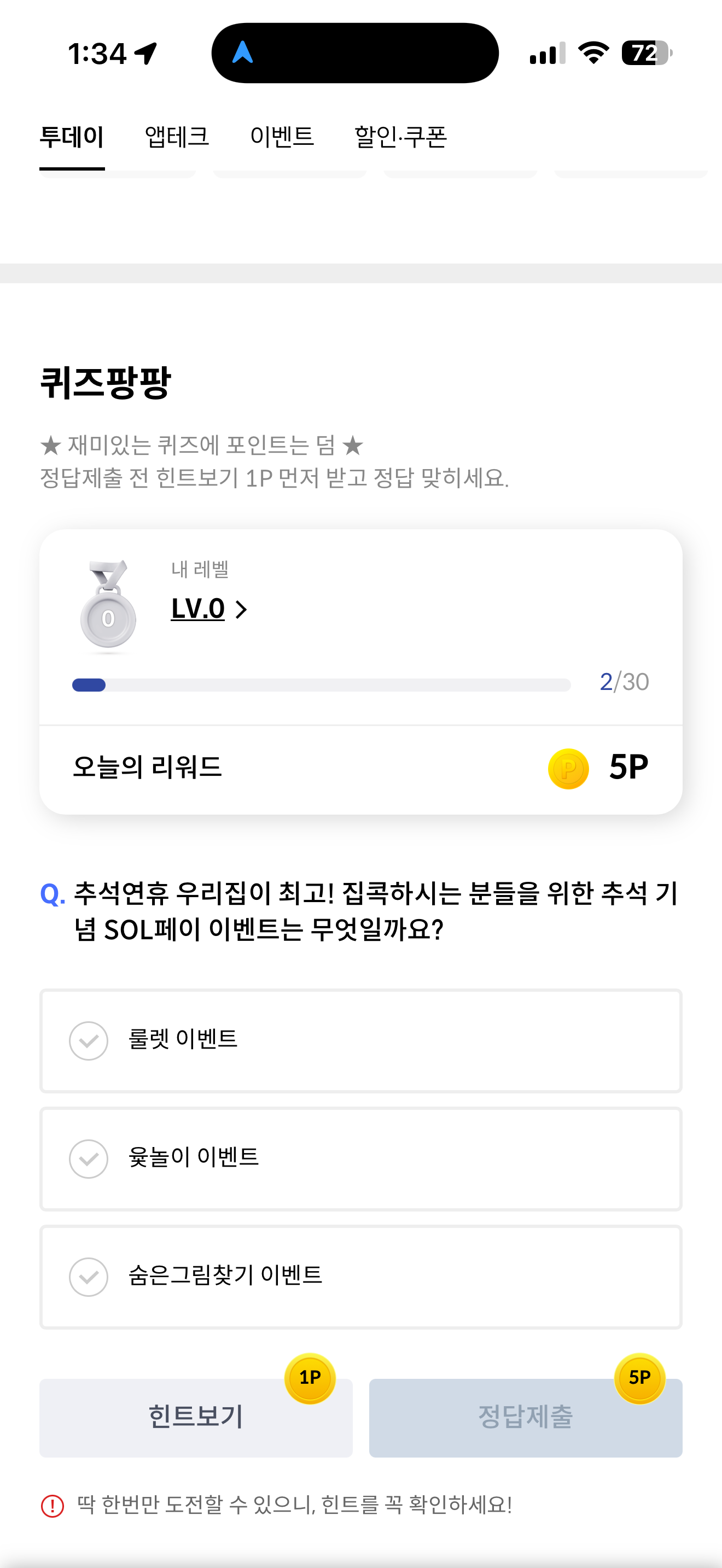 추석연휴 우리집이 최고! 집콕하시는 분들을 위한 추석 기념 SOL페이 이벤트는 무엇일까요? 보기는 1. 룰렛 이벤트 2. 윷놀이 이벤트 3. 숨은그림찾기 이벤트 입니다