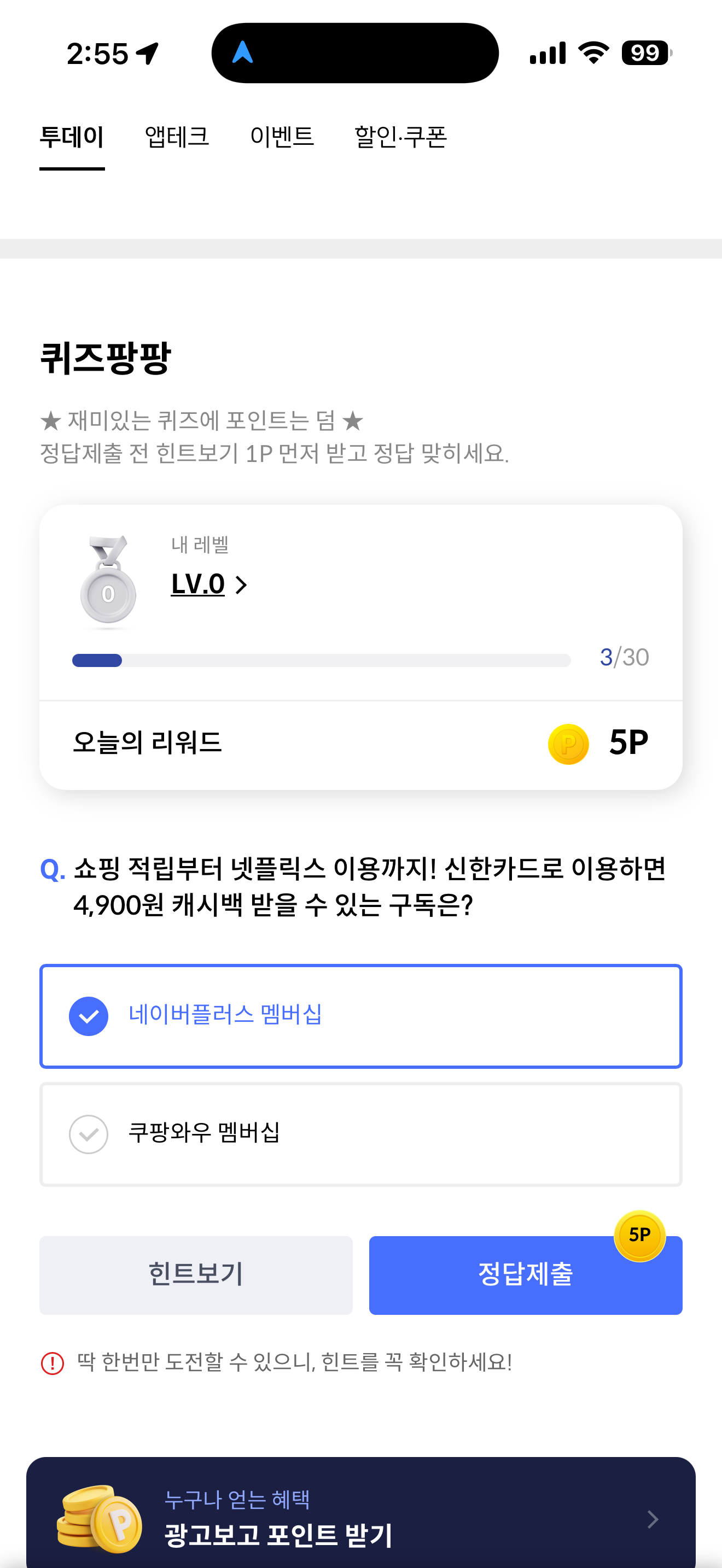 신한카드 퀴즈팡팡 정답은 네이버플러스 멤버십 입니다
