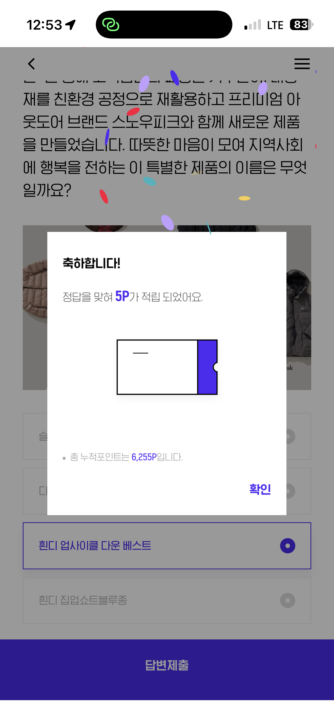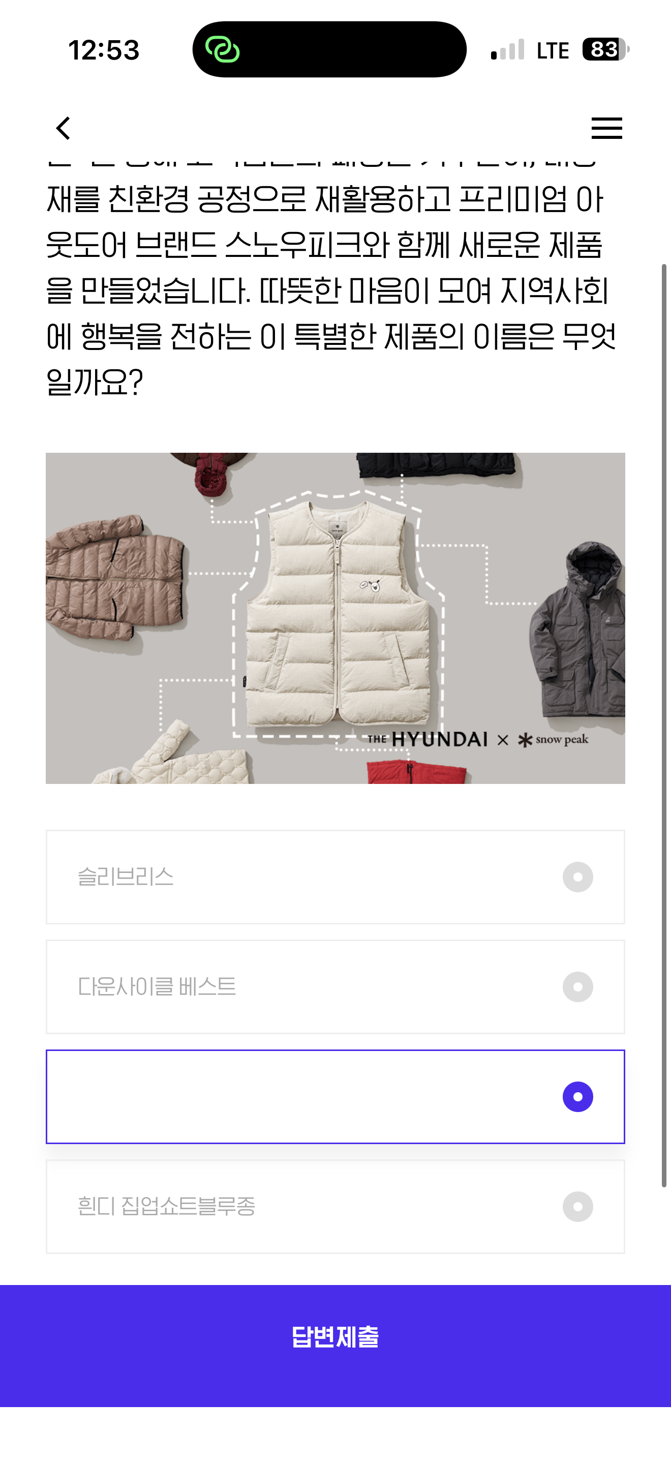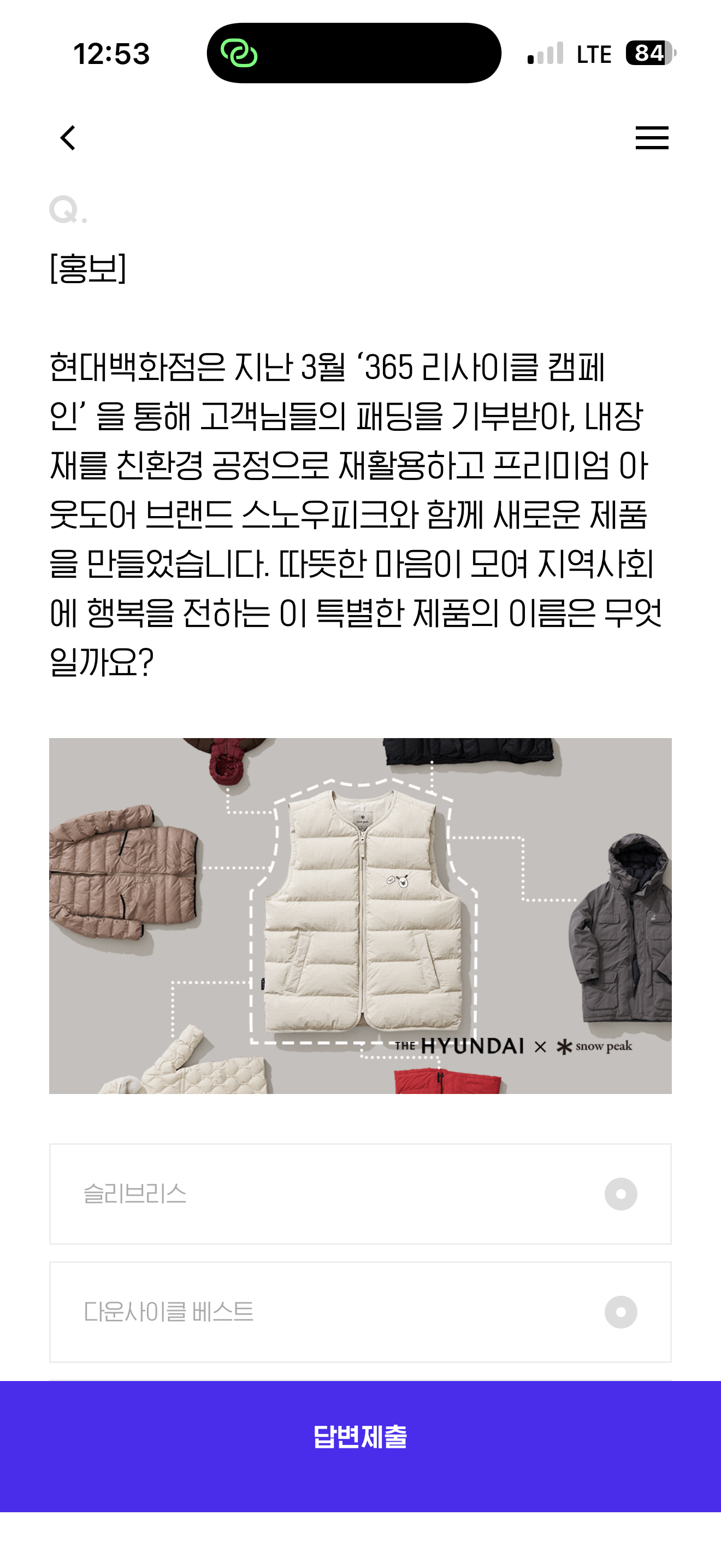 H포인트 퀴즈 정답은 흰디 업사이클 다운 베스트 입니다