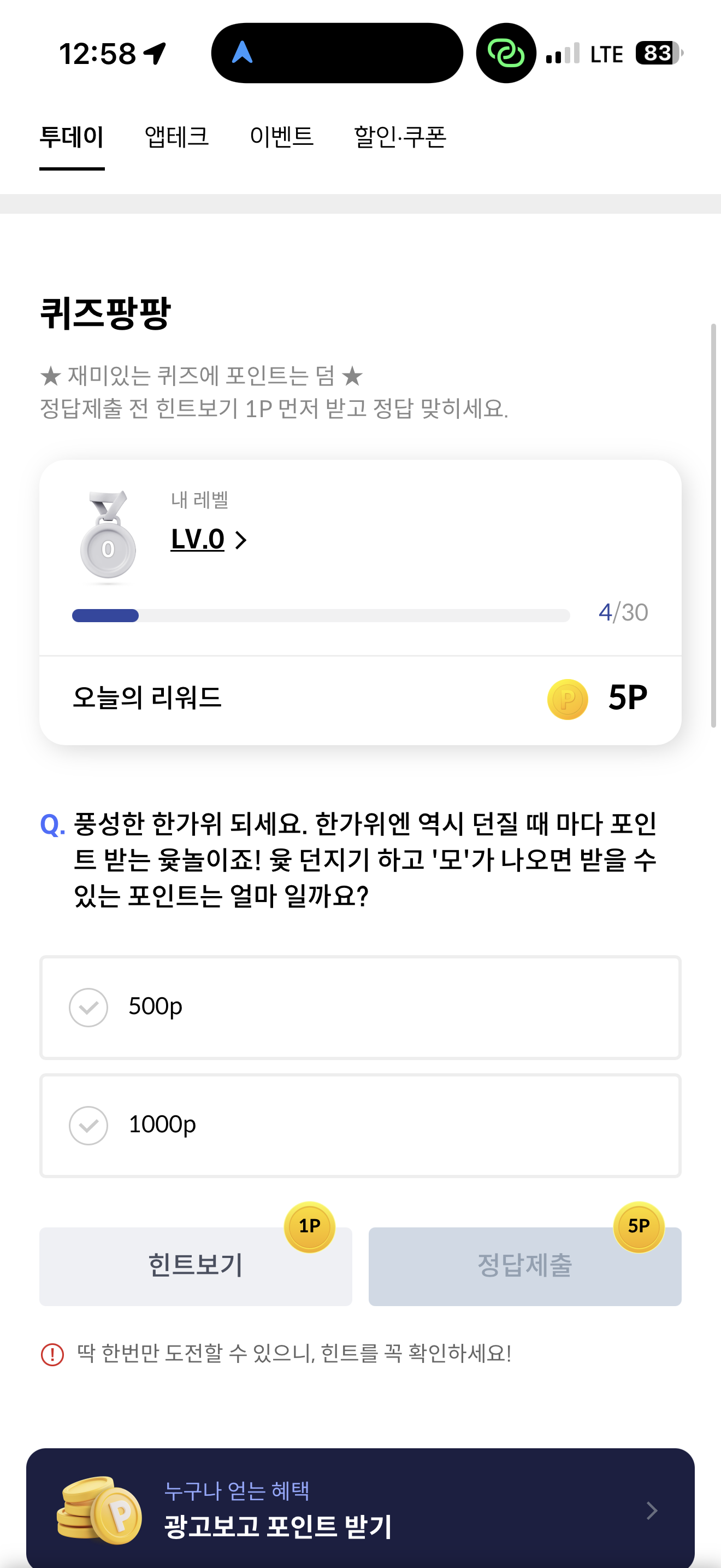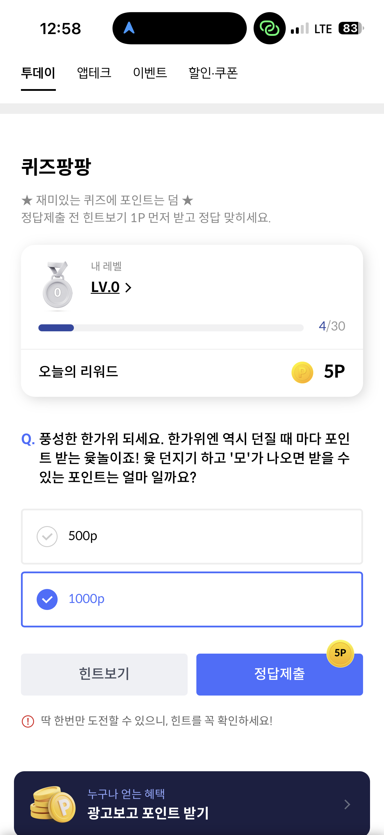 신한카드 퀴즈팡팡 정답은 1000P 입니다